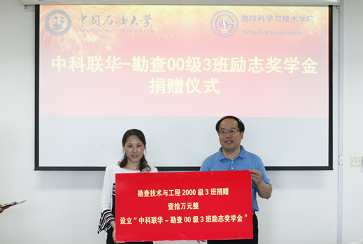 【本站讯】6月17日下午,公司勘查技术与工程2000级3班员工彭斐、尹成芳回到母校,代表勘查2000级3班全体员工向母校捐赠10万元,设立“中科联华-勘查00级3班励志奖学金”。副董事长姚军出席仪式,代表公司接受捐赠并回赠捐赠证书和纪念牌。公司合作发展处、十大体育网站相关领导及师生代表参加捐赠仪式并与员工座谈交流。