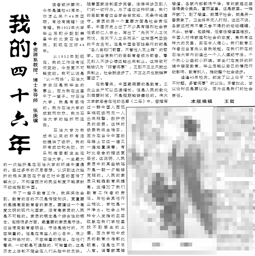 总觉得自己并没有什么资格去悼念张先生,我并非先生的爱徒,况且,先生与我隔了太多的时空。先生自建校起就与公司共荣共华,一生丰功伟绩,桃李芬芳;而我,刚进入公司任教,总觉得自己道阻且长,稚气未脱。我在求学路上一直听闻先生,却无缘相见,而今与先生的唯一交汇竟是先生辞世,我作为测井界的一员参与了对您的追思和葬礼。现在十一长假,举校欢庆六十五华诞,我却更频繁的想起先生,脑海里总浮起先生的音容笑貌,于是斗胆提笔下字,梳理思绪,希望借此能让先生的音容笑貌更长远的指引我以后的路。