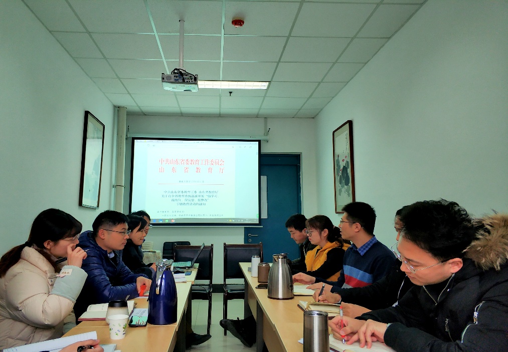 周晓东老师带领全体参会人员研读《中共山东省委教育工委 山东省教育厅关于在全省教育系统迅速开展“强学习、提站位、深反思、促整改”专题教育活动的通知》,重点学习了党中央、国务院有关依法治校、依法从教、规范办学的决策部署,省委、省政府、教育部有关政策要求,省委教育工委、省教育厅有关文件规定等。徐永涛副书记以“红蓝导向”为切入点,提出“立德树人”是教育之本,一方面要在制度上层层把关,紧抓学术科研道德与安全教育;另一方面要深化员工的“红线”意识,关注员工心理动态,构建家校同心信息畅通机制。