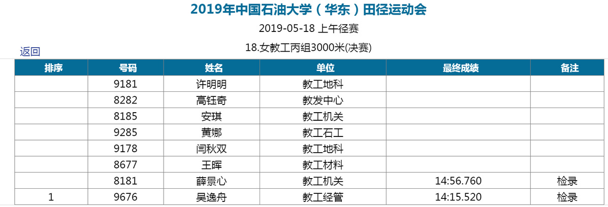 3000米,全校上了两个人,我们许明明是身体不好没有办法,其他老师要是顶上两个肯定有分;我们有的老师不敢上场、有些老师好面子怕得不到名次。明年应该所有项不缺,分还能更多点。