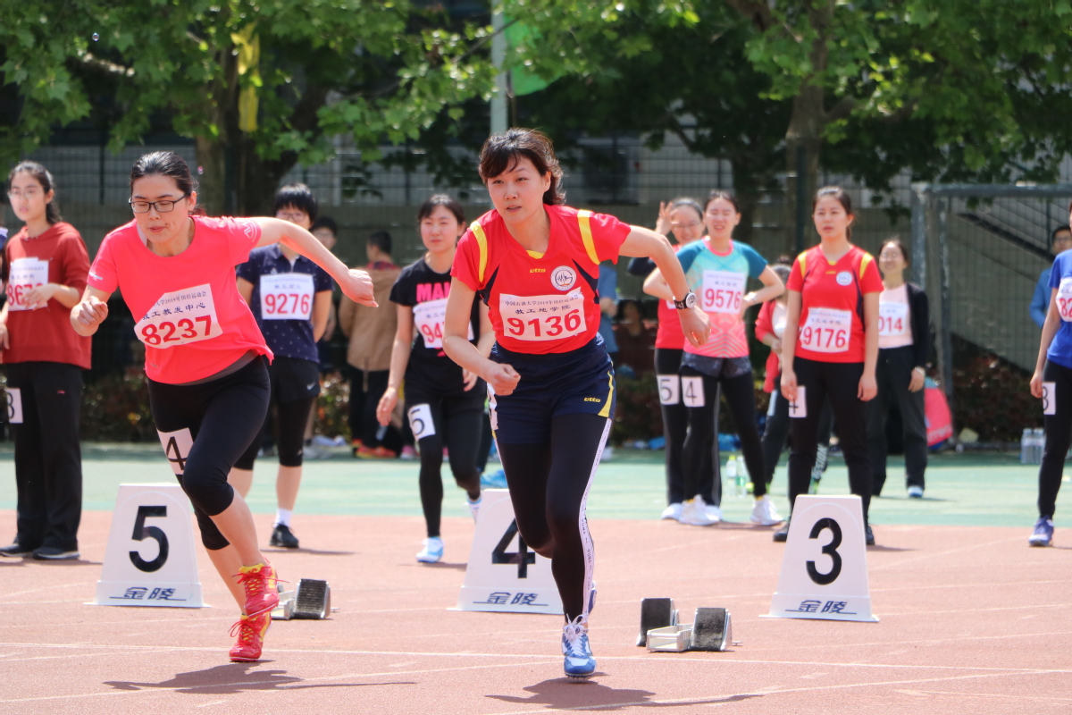 张敏蝉联100米、200米冠军(张敏在做准备,后面的起跑器把别人镇住了;本次运动会女队许多工作是张敏联系的,真是很负责的女工会干部,应该向领导们建议建议,以后去校工会干一个工会副主席!)