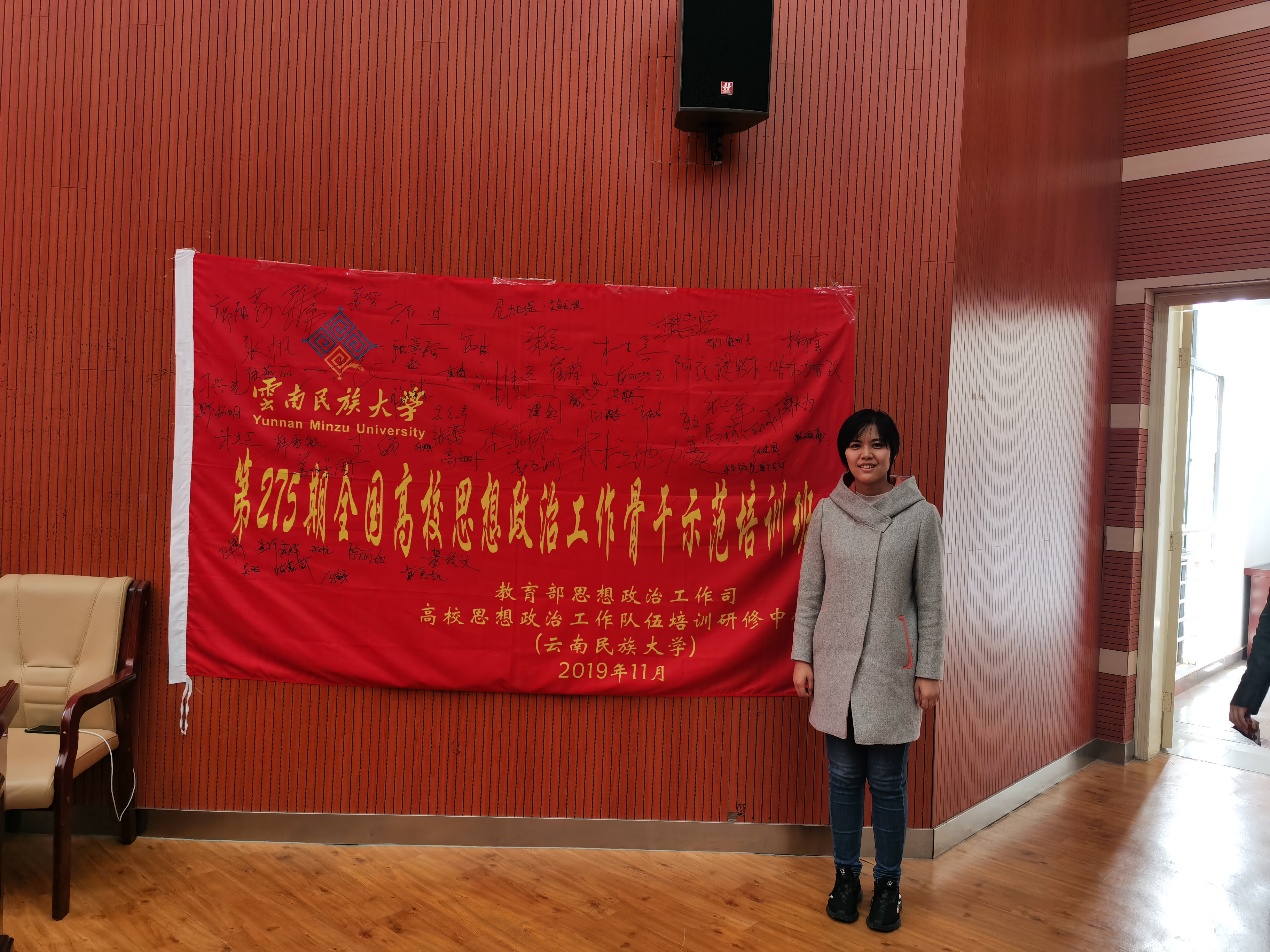 11月20-23日,教育部第275期全国高校思想政治工作骨干示范培训班在云南民族大学举行。来自全国95所高校的思想政治工作骨干教师齐聚云南昆明学习交流,公司辅导员张蕾参加了此次培训。