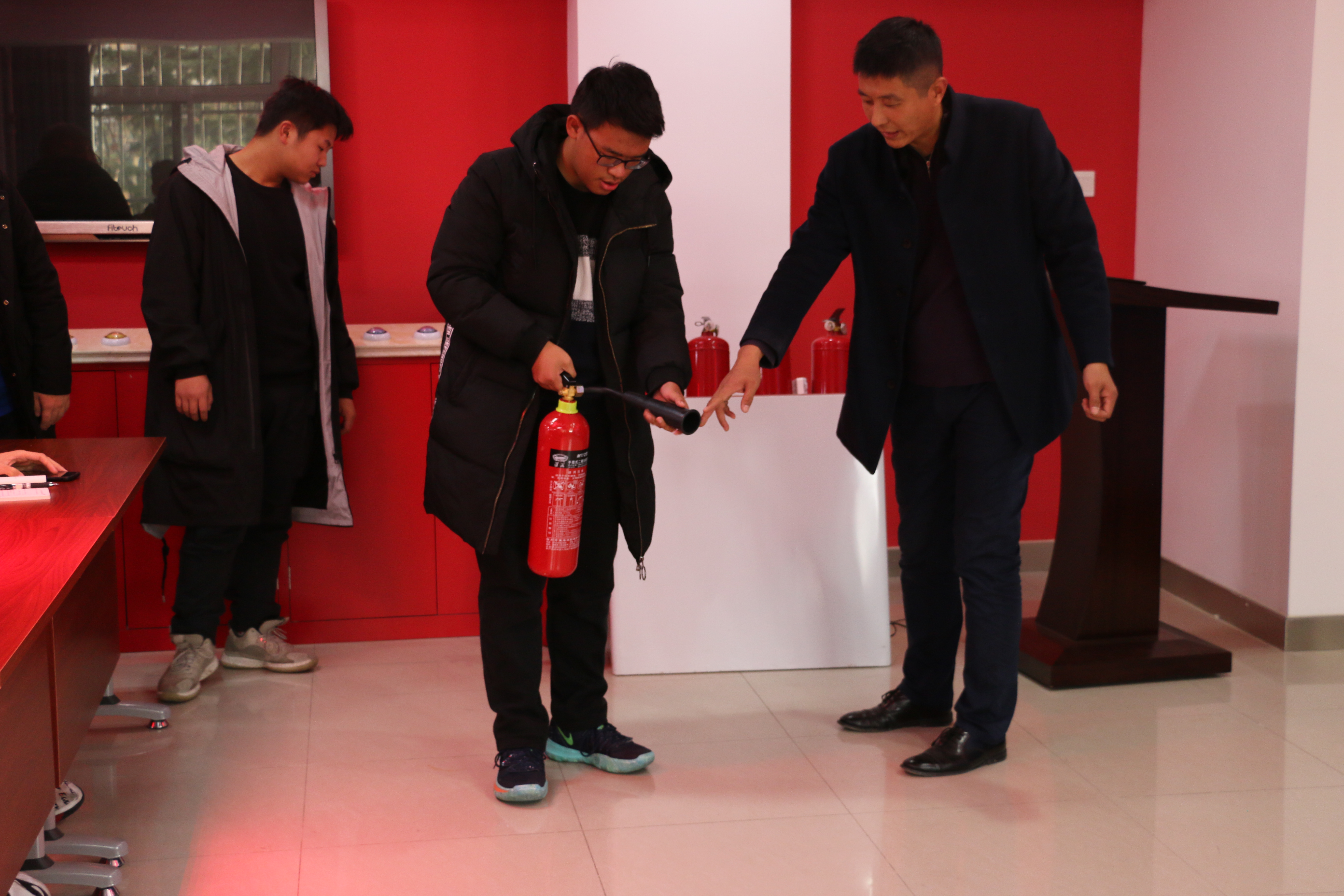 石鹏飞指导员工正确使用灭火器 刘星宇摄
