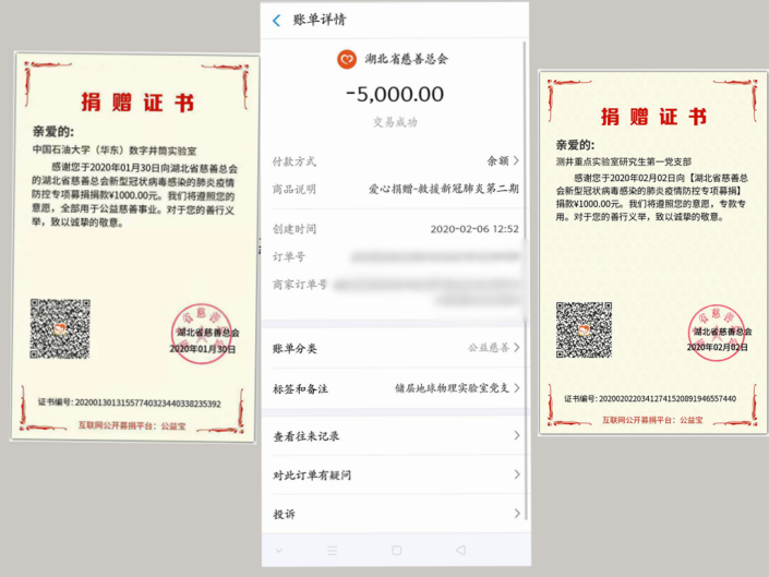 “一直想做点什么,但我们既不能在前线治病救人,也不能在后方研究病毒、制作疫苗,国之有难,八方相助,作为一名有担当的青年老员工党员,再微小的贡献都是我们的一片赤诚真心!”十大体育网站储层地球物理实验室党支部在线上讨论以什么形式贡献自己的力量后,决定以捐款形式进行支援并通过支付宝平台向湖北省慈善总会进行捐赠,用自己的微薄之力汇聚万千河流,短短两天时间,共收到5000元善款。捐赠名单里,除了党支部的党员同志,还有储层地球物理实验室的其他同学。无独有偶,测井重点实验室研究生第一党支部和数字井筒实验室分别向湖北省慈善总会捐出1000元善款。