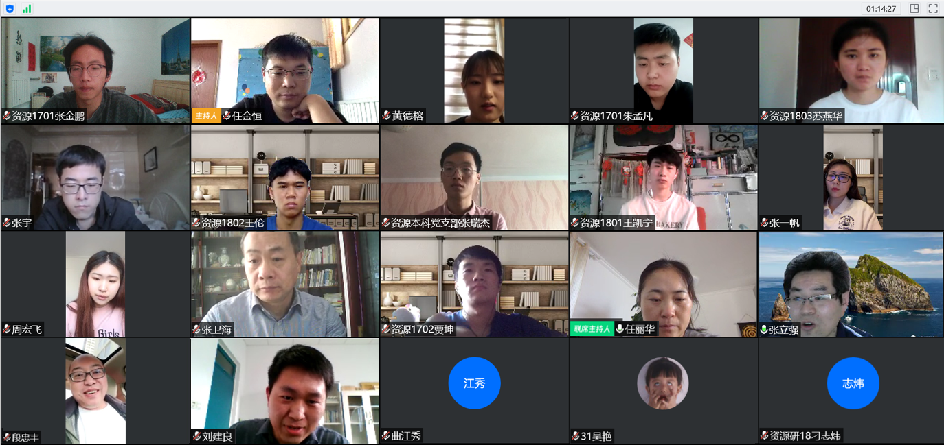 当前,新冠肺炎疫情正在全球范围内迅速蔓延,波及绝大多数国家和地区,我国在以习近平同志为核心的党中央坚强领导下,疫情防控形势持续向好,取得了阶段性成效。为引导青年党员坚定理想信念,增强专业本领,提高服务国家的能力,十大体育网站资源勘查工程专业本科生、研究生和教工党支部于4月30日在线上开展主题教育活动。资源专业部分本科生和研究生党员,资源系教工党支部委员、系主任及部分教工党员参加了此次活动,活动由本科生党支部书记任金恒、教工党支部青年委员任丽华主持。