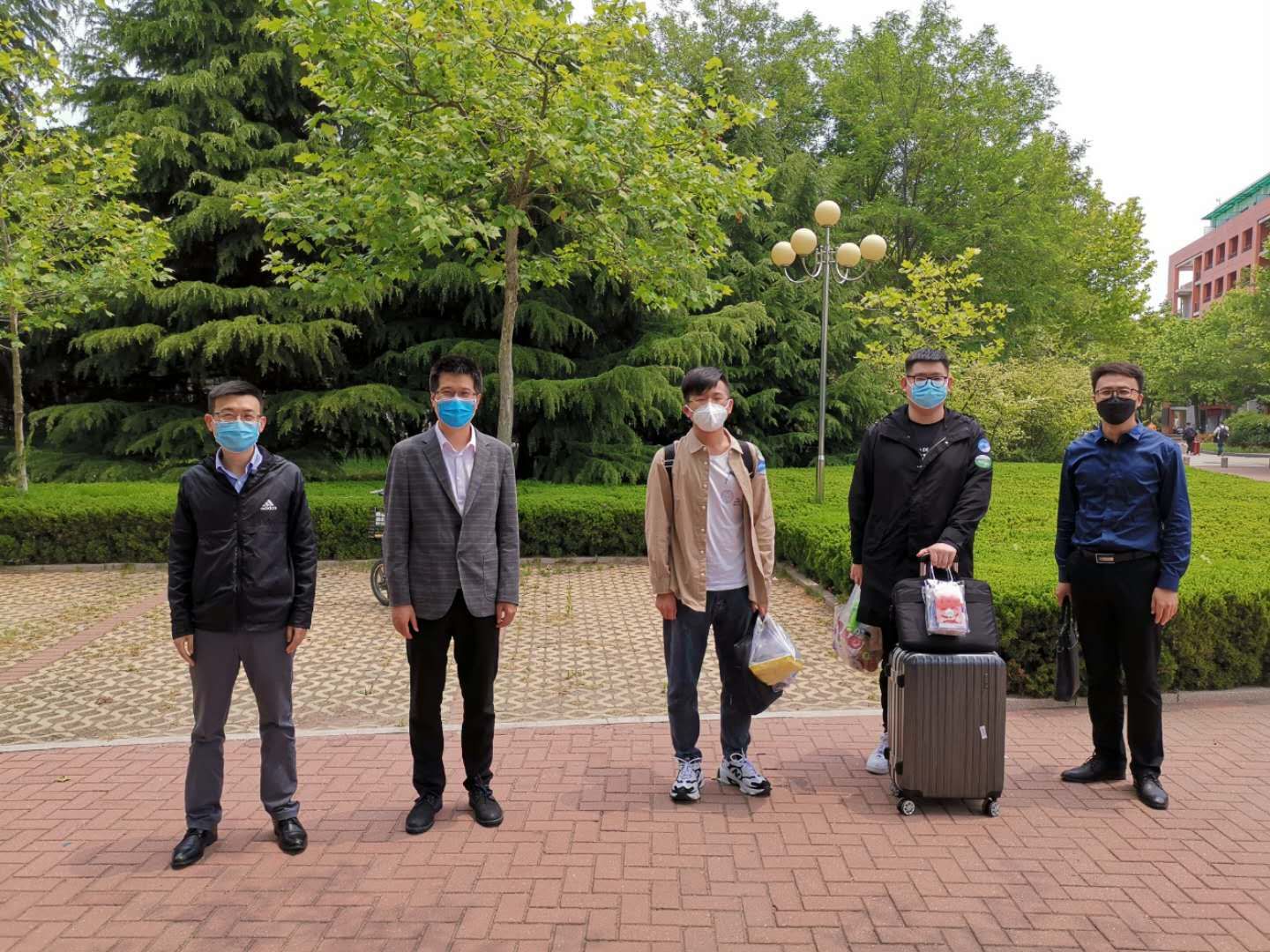 报到现场,返校员工在工作人员的引导下,积极配合身份核验、体温检测、行李消毒等工作。公司为每一名返校同学安排了新冠病毒核酸检测采样,在等待核酸检测结果期间,有辅导员亲自将餐食送到宿舍。采样结束,返校同学领取公司准备的“防疫健康包”,里面包含口罩、体温计、消毒湿巾、防护手册等一应物品,然后沿指定路线回到宿舍楼,整个返校过程井然有序。26日清晨,地物1601班的崔立超进入校门,幸运地成为公司第一个到校的员工,与早早就在门口迎接的领导老师们来了一张珍贵的“会师”合影。
