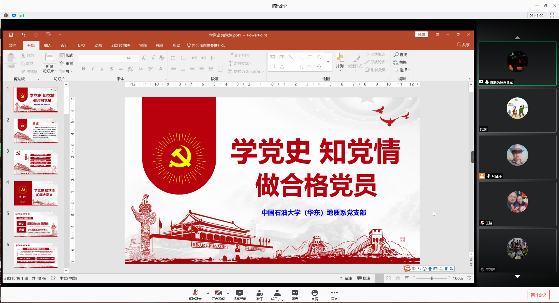 2020年6月29日,为庆祝中国共产党成立99周年,重温党的光辉历程,深入全面了解党史党情,坚定理想信念。地质系党支部以线上会议方式开展迎“七一”主题党日活动。地质系党支部全体教师参加会议,支部书记陈勇教授主持会议。