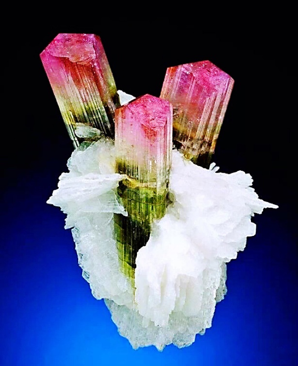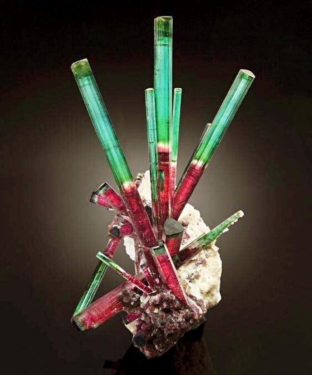 物理性质:黑电气石般呈绿黑色至深黑色; 锂电气石常呈玫瑰色、蓝色或绿色,也有呈无色;镁电气石的颜色变化于无色到暗褐色之间。此外在同一个晶体横切面上,还会出现不同 颜色所组成的环带,或沿c轴的两端呈现不同的颜色。玻璃光泽,硬度7; 无解理;参差状断口。密度3.03~3.25g/cm3。