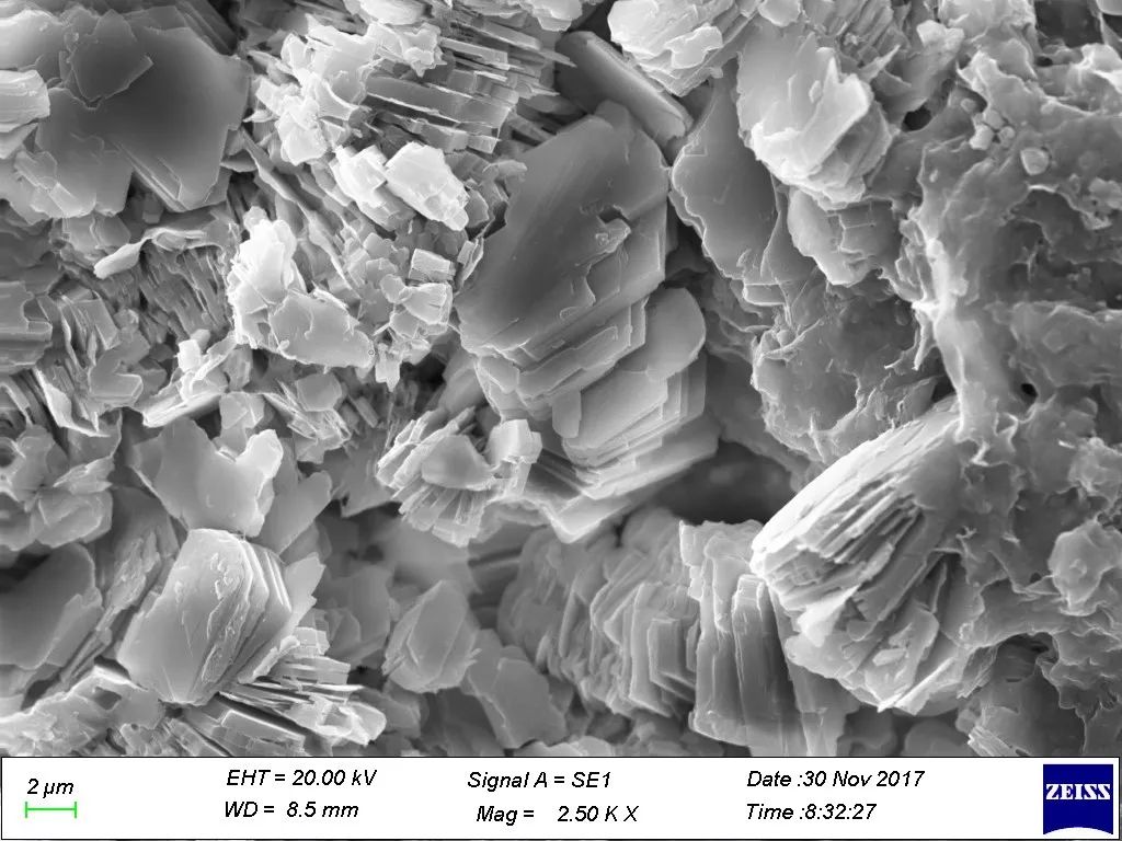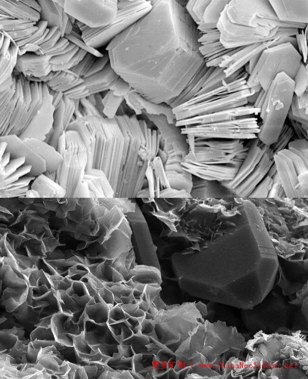 [化学组成]上式中E为层间可交换阳离子,主要为Na+、Ca2+,其次有K+、Li+等。x为E作为一价阳离子时单位化学式的层电荷数,一般为0.2~0.6。根据层间主要阳离子的种类,分为钠蒙脱石、钙蒙脱石等成分变种。在晶体化学式中,H2O(结晶水或层间水等)一般都写在式子的最后面,但在蒙脱石中,H2O写在前面,表示H2O与可交换阳离子一起充填在层间域里。E与H2O以微弱的氢键相连形成水化状态,若E为+1价阳离子,离子势小,形成1层连续的水分子层;若E为+2价阳离子,形成2层连续水分子。这表明水分子进人层间与层格架(单元层)没有直接关系。水的含量与环境的湿度和温度有关,可多达4层。
