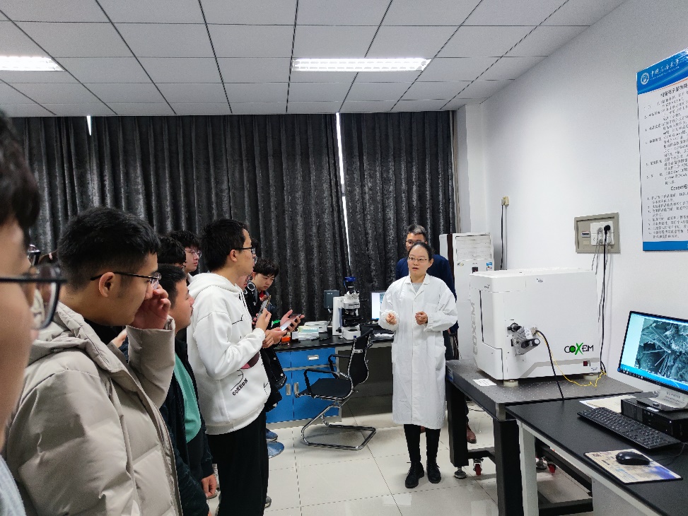 随后,在远光辉老师的带领下,班级同学依次参观了地质制样室、HPHT流体-岩石相互作用实验室、多尺度储层表征实验室、聚焦离子束/电子束双束系统实验室、油气同位素实验室。在地质制样室中,班级同学近距离观察了原石制作成薄片的工序和具体过程,了解了岩心切割机、切磨机等设备的用途。远光辉老师结合地球科学概论课程中所涉及的知识进行简单提问,引导员工积极思考。参观过程中,远光辉老师邀请正在多尺度储层表征实验室管理老师宋玲向班级同学详细介绍了扫描电子显微镜的特征、工作原理以及操作流程,“光学显微镜只能放大几十到几百倍,扫描电子显微镜可以放大20万倍,让研究人员观察微米、纳米级别的岩石微观结构更加准确。”宋玲娓娓道来。在油气同位素实验室,全力博士和杨路硕士,系统介绍了253plus无机和有机,253ultra以及LA-ICP-MS等仪器在稳定同位素、团簇同位素和碳酸盐岩的U-Pb定年和微区微量元素等方面的应用。