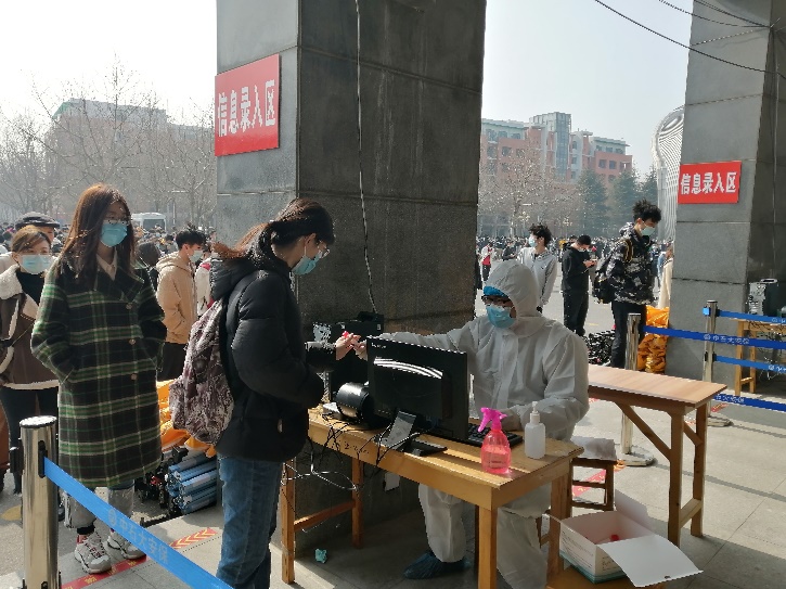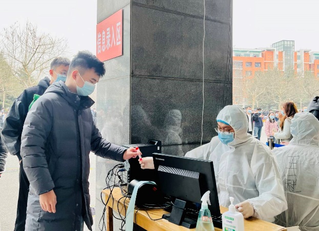 资源系党支部党员王广伟和王奇老师在核酸日检现场进行志愿者服务