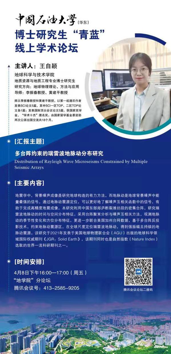 博士研究生“青蓝”线上学术论坛-十大体育网站分论坛第1期-王自颖博士-多台阵约束的瑞雷波地脉动分布研究