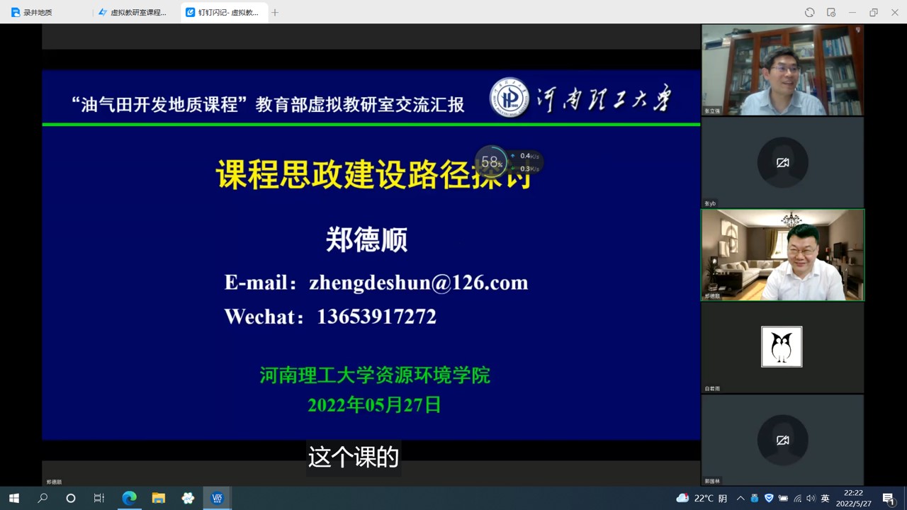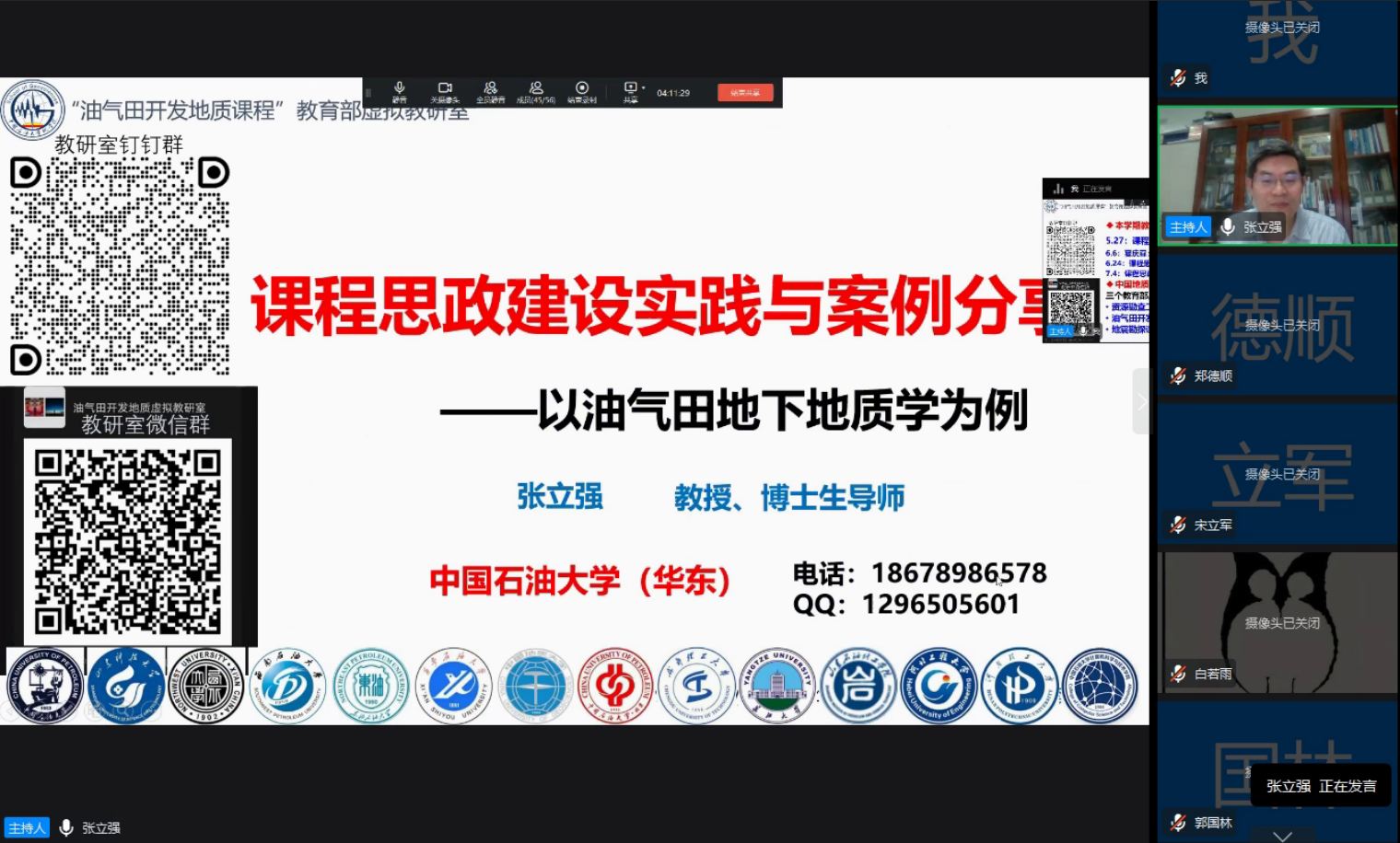 油田开发地质课程教育部首批虚拟教研室建设点从今年3月开始开展了系列研讨活动,规划了教研室2022年工作重点、规范了教学活动时间和相关制度。按照计划,5月27日,油气田开发地质课程教育部虚拟教研室开展了课程思政专题分享和研讨活动。来自十大体育网站、中国地质大学(武汉)、中国矿业大学(北京)、吉林大学、西北大学、长安大学、中国石油大学(北京)、东北石油大学、西安石油大学、河南理工大学、山东科技大学、青海大学等20余所高校的56名教师参加了本次研讨活动。十大体育网站张立强教授主持了会议。