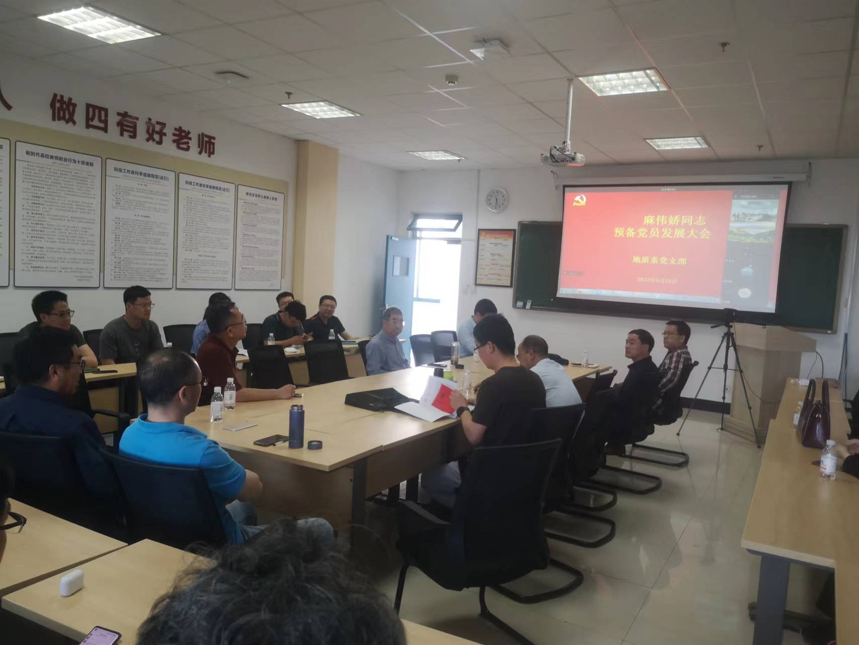 5月24日下午,根据工作安排,地质系党支部在系会议室召开党支部大会。本次大会由两个议题组成,一是讨论接收麻伟娇同志为中国共产党预备党员,二是启动“红色传承”活动,支部书记孟凡超主持会议。