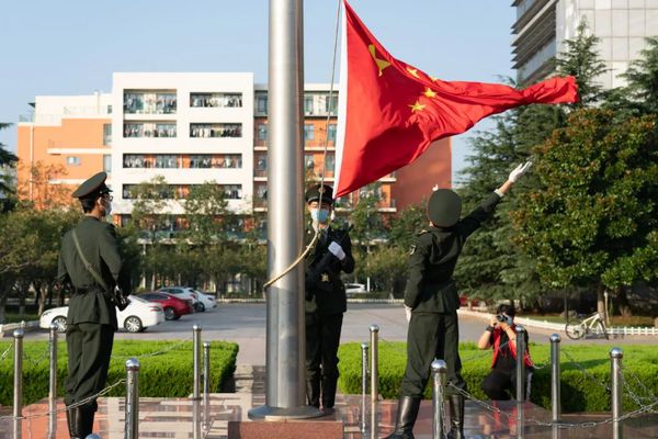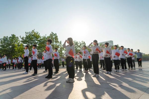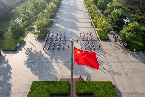 晨曦初露,旭日将升,国旗护卫队迈着坚定有力的步伐走向子元广场中心。红旗冉冉升起,国歌响彻云霄,全体师生肃立致敬,行注目礼。
