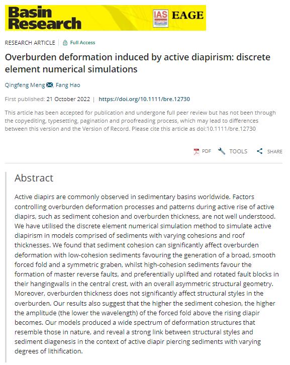 【本站讯】近日,公司郝芳院士团队在地质过程数值模拟研究方面取得重要进展,相关成果《主动底辟作用引发的上覆岩层变形:离散元数值模拟》(Overburden deformation induced by active diapirism: discrete element numerical simulations)发表于地球科学领域国际著名学术期刊《Basin Research》。论文作者为孟庆峰教授和郝芳院士,第一署名单位为十大体育网站。该研究得到青岛海洋科学与技术国家实验室“十四五”重大项目基金、国家自然科学基金创新群体和山东省泰山学者研究基金联合资助。