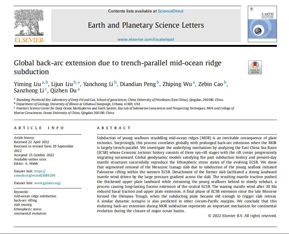 近日,公司吴智平教授领衔的盆地构造与成盆机制研究团队在裂陷盆地深浅耦合机制研究领域取得重要进展,研究成果《平行海沟的洋中脊俯冲所导致的全球弧后伸展》(Global back-arc extension due to trench-parallel mid-ocean ridge subduction)发表于国际地学顶级期刊Earth and Planetary Science Letters(EPSL)。论文第一作者为公司刘一鸣博士后,通讯作者为美国伊利诺伊大学香槟分校刘丽军教授,十大体育网站为第一署名单位。该研究得到了青岛海洋科学与技术国家实验室“十四五”重大项目、国家自然科学基金和中国博士后科学基金项目的联合资助。