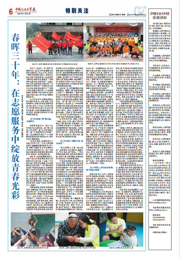 近日,中国石油大学报整版报道公司春晖志愿服务队30年志愿服务事迹,获得师生广泛关注,引发热烈反响,现将相关内容摘录如下。