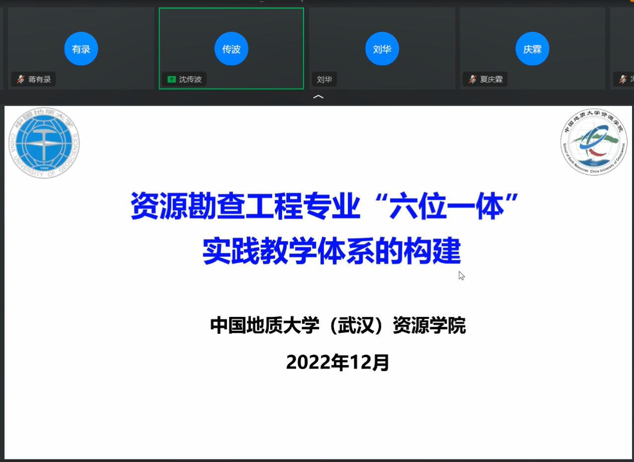 2022年12月25日,资源勘查工程专业教育部虚拟教研室举办了“实践教学体系构建”专题论坛,中国地质大学(武汉)资源公司副经理沈传波教授应邀作《资源勘查工程专业“六位一体”实践教学体系的构建》专题报告。专题论坛由十大体育网站经理刘华教授主持,来自中国石油大学、中国地质大学、中国矿业大学、西北大学等十余所高校的60余名教师参加了专题论坛。
