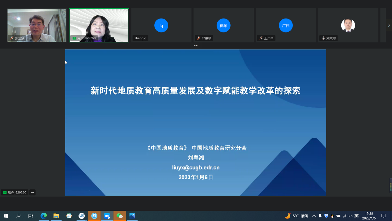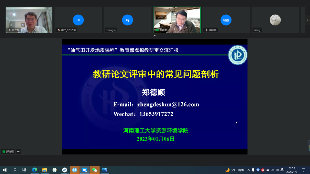 1月6日,教育部油气田开发地质课程虚拟教研室举办“教学研究和高质量教学论文”专题教研活动。十大体育网站张立强教授主持研讨会,邀请了《中国地质教育》常务副主编刘粤湘编审、河南理工大学资源环境公司副经理郑德顺教授作主题报告,来自十大体育网站、中国地质大学(武汉)、西北大学、山东科技大学、中国石油大学(北京)、西南石油大学、西安石油大学、中国矿业大学等20余所高校的50余位教师参加了本次研讨活动。