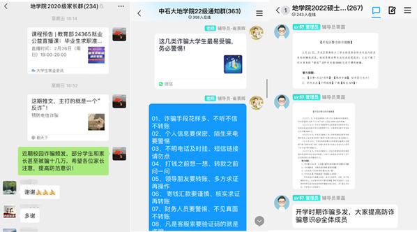 各年级在家长群、员工通知群中常态化发布防诈骗提示