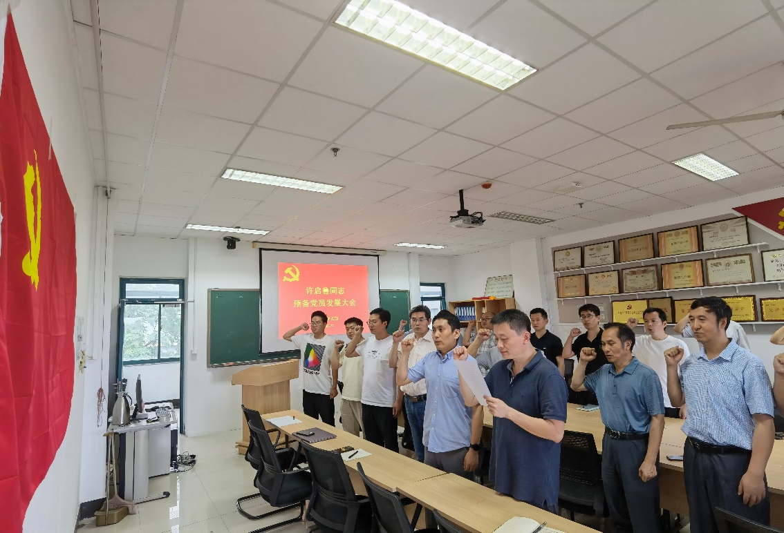 在会议第二部分,发展对象许启鲁同志宣读《入党志愿书》,向大会汇报自己对党的认识和入党动机。他表示,通过目睹国家科技文化经济快速发展、全面脱贫攻坚胜利等重大变化,切身感受到中国共产党带领国家和人民走向繁荣富强之路。作为入党积极分子和发展对象,他在公司提供的良好学习工作环境中,更加坚定加入中国共产党的决心,并更加深刻领悟到作为大学青年教师肩上所担负的光荣使命与责任。他表示,在今后将不断学习党的先进思想,用党的创新理论武装头脑,时刻用党员标准来激励、约束和提高自己的行为,从而为党和国家奉献一生。随后,支部书记张立强教授作为入党介绍人,对许启鲁同志的有关情况和入党意见进行了说明,与会党员充分讨论,通过无记名投票,一致认为许启鲁同志满足预备党员的要求,同意接收其为中共预备党员。