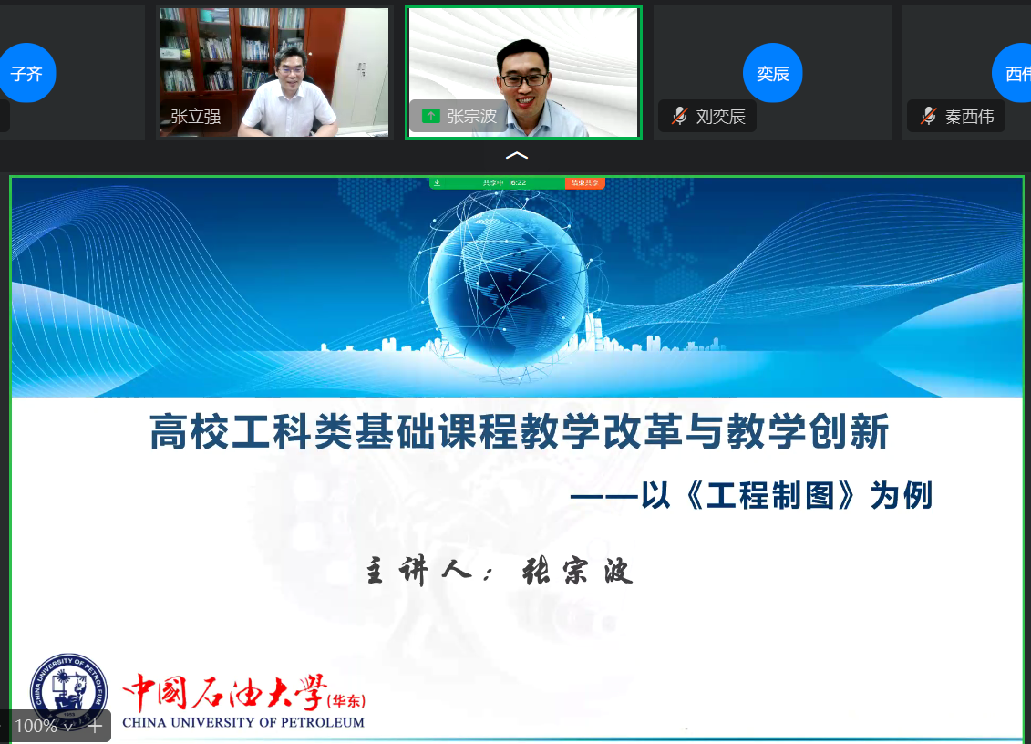 2023年9月8日晚,教育部“油气田开发地质课程虚拟教研室“举办课程教学创新及讲课比赛专题讲座,邀请了十大体育网站教授张宗波作题为《高校工科类基础课程教学改革与教学创新大赛—《工程制图》为例》的专题报告,资源系部分教师,以及来自山东科技大学、西北大学、中国地质大学(武汉)、贵州大学和河北工程大学等全国十余所高校科研院所70余人参加了线上会议,教育部虚拟教研室负责人、资源系主任张立强教授主持会议。