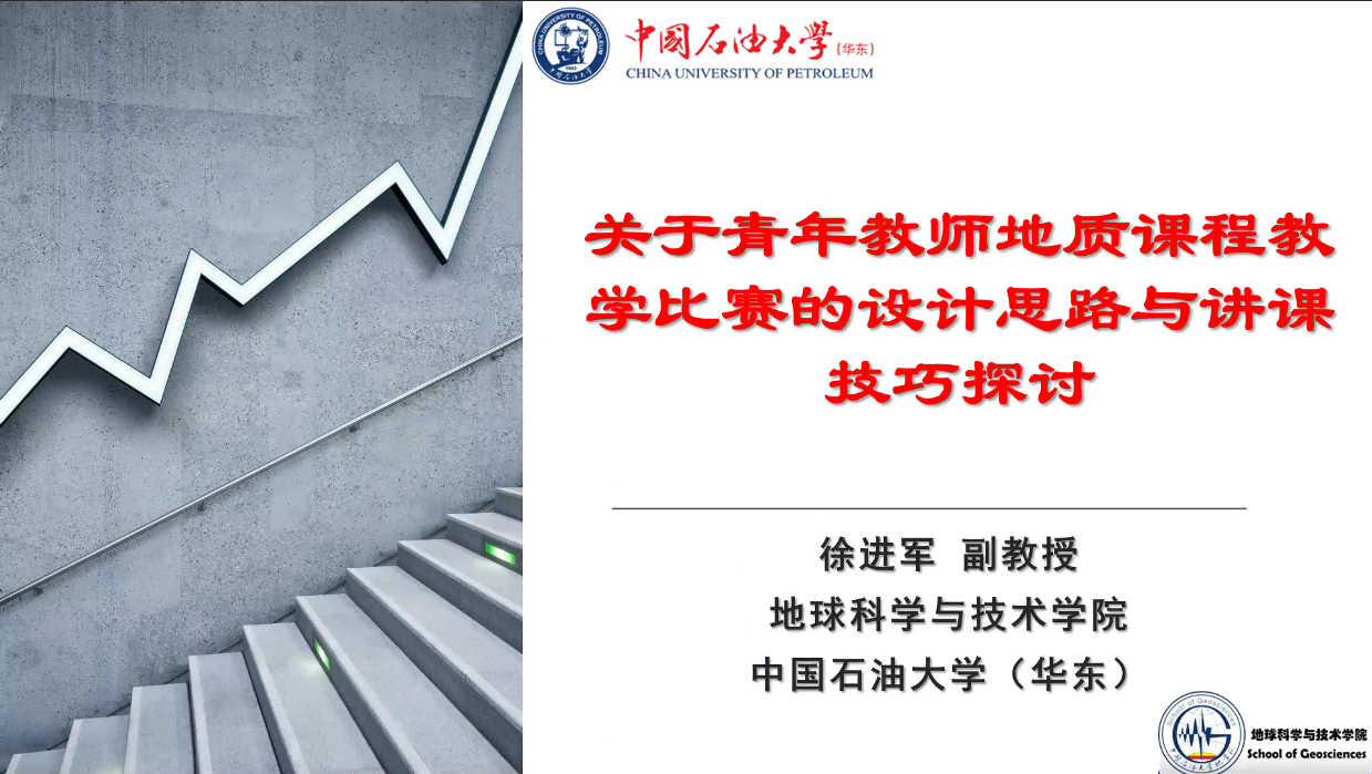徐进军副教授作题为《关于青年教师地质课程教学比赛的设计思路与讲课技巧探讨》的专题报告,他首先介绍了全国大学青年教师地质课程讲课比赛的概况,该比赛是39个全国性高校教师教学竞赛之一,也是我国地质类学科级别最高、规模最大的教师教学竞赛。徐进军老师强调,教学方案的设计的基本思路是问题引入、前堂回顾、新内容讲解、重难点清晰、课堂总结、引入问题的解答、下节预习,而比赛多媒体需要保证文字简明扼要、配图合适、图文并茂,同时内容间衔接合理、流畅,尽量简约不简单、美化不花哨。徐进军老师重点分享了他积累的教学技巧,包括情绪表达、主题引入、内容突出、强化逻辑、大回环、教辅相成、精雕细琢、扬长避短和虚心请教,他最后分享感悟道:1、教学经验,需要长期的积累;2、教学技巧,需要用心的钻研;3、教学素材,需要丰富的科研;4、教学比赛,源教利教促成长。