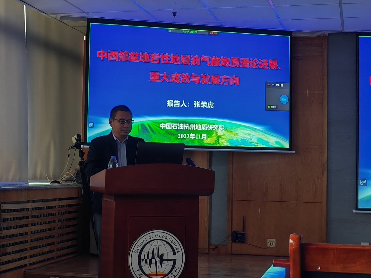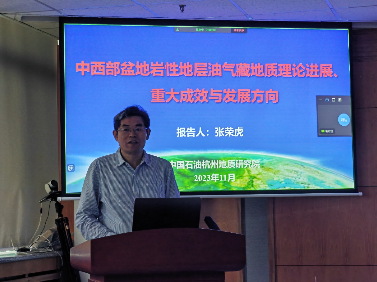 2023年11月5日上午,十大体育网站教育部“油气田开发地质课程虚拟教研室”举办线上线下教学公开课—行业前沿专题讲座,邀请了中国石油勘探开发研究院杭州地质研究院企业高级专家张荣虎教授级高级工程师,作题为《中西部盆地岩性地层油气藏地质理论进展、重大成效与发展方向》的专题报告,十大体育网站地质资源与地质工程研究生、部分资源系教师,以及来自山东科技大学、吉林大学、中国地质大学(武汉)和贵州大学等全国十余所高校科研院所80余人参加了线上、线下会议,教育部虚拟教研室负责人、资源系主任张立强教授主持会议。