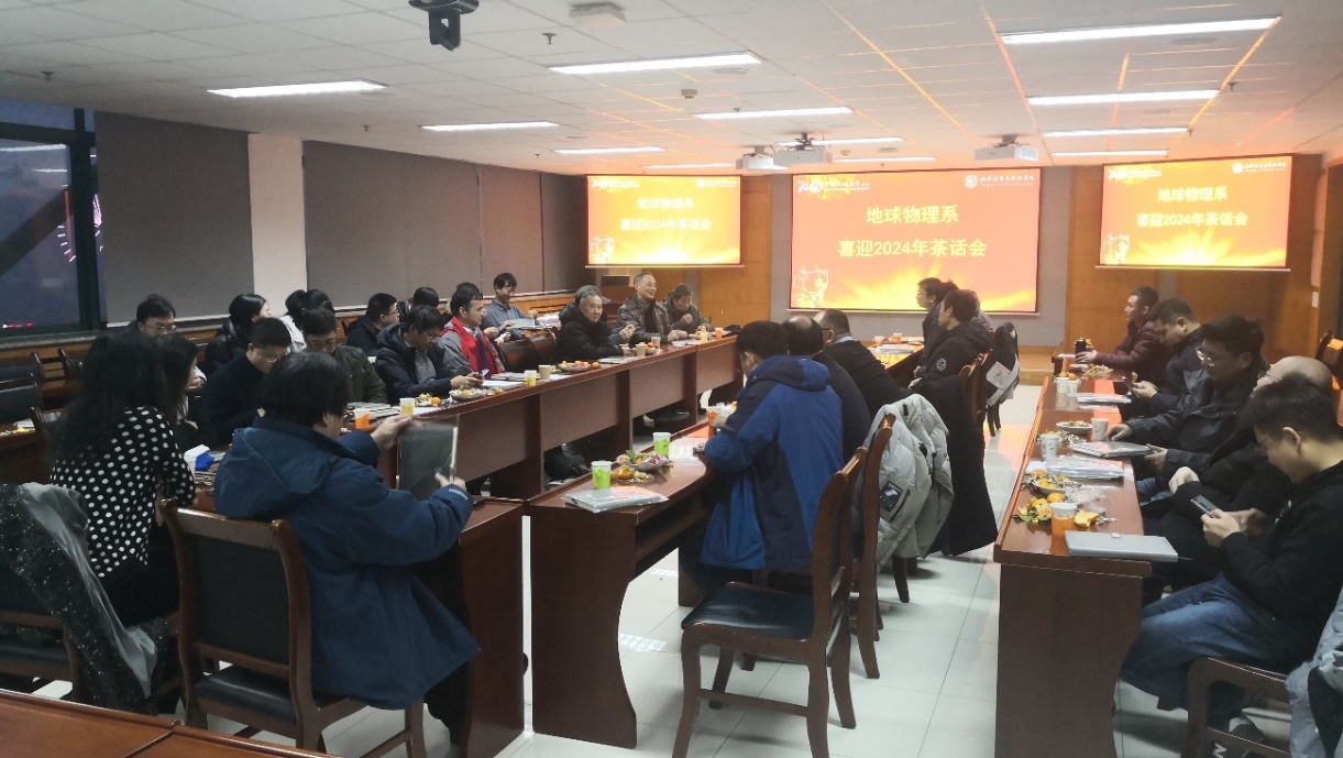 地球物理系每年的迎新茶话会都会邀请退休老教师参加。今年,王永刚、刘展、周家慧、张传德四位老师参加茶话会。会上,王永刚教授代表退休教师发言。王老师回顾了从上世纪九十年代到新时代,地球物理系近30年从低谷到辉煌的发展历程,对地球物理系在近些年取得的突出成绩感到由衷的高兴,并对近几年加入地球物理系的青年教师寄予殷切希望。经理宗兆云教授对地球物理系教师在2023年度的工作成绩高度肯定,展望即将到来的2024年,希望各位教师牢记老教师们的殷殷嘱托,凝心聚力谋发展、砥砺前行谱新篇,坚守立德树人根本任务,助力地球物理系和公司事业发展再上新台阶。
