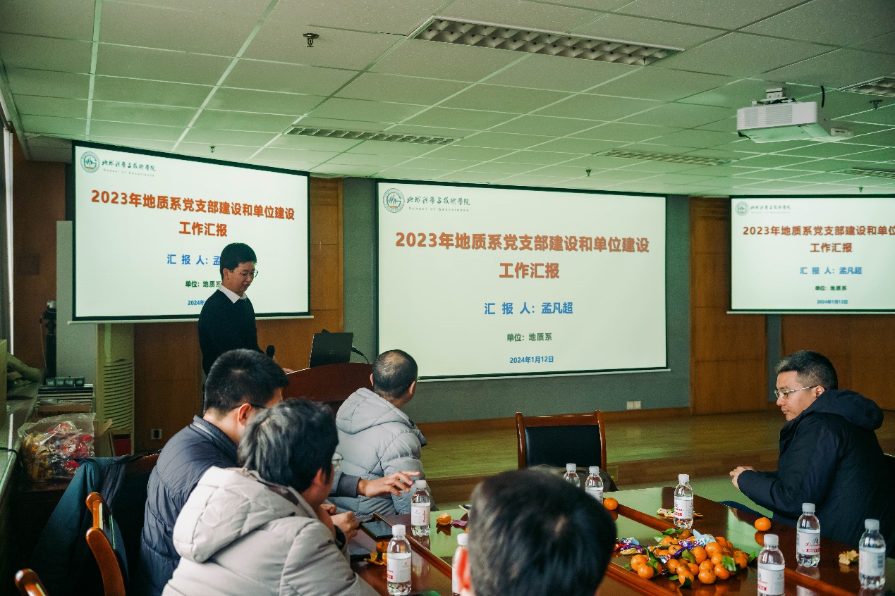 随后,党支部书记孟凡超教授向全系教师汇报了地质系2023年度的党支部和单位建设工作。2023年地质系党支部继续巩固全国样板党支部建设成果,组织多次主题党日活动,创新党员实践教学方式;获批公司党委重点党建课题1项,入选省级课程思政示范课程1项;入选山东省本科高校黄河重大国家战略课程思政优秀案例1项;吸收正式党员1人;初步建成小黄山地质公园,助力科左后旗扶贫工作,成功举办第十七届全国古地理学及沉积学学术会议;强化本科生导师1+2政策,推动实践思政落地,积极参与公司和公司工会活动,并取得优异成绩。