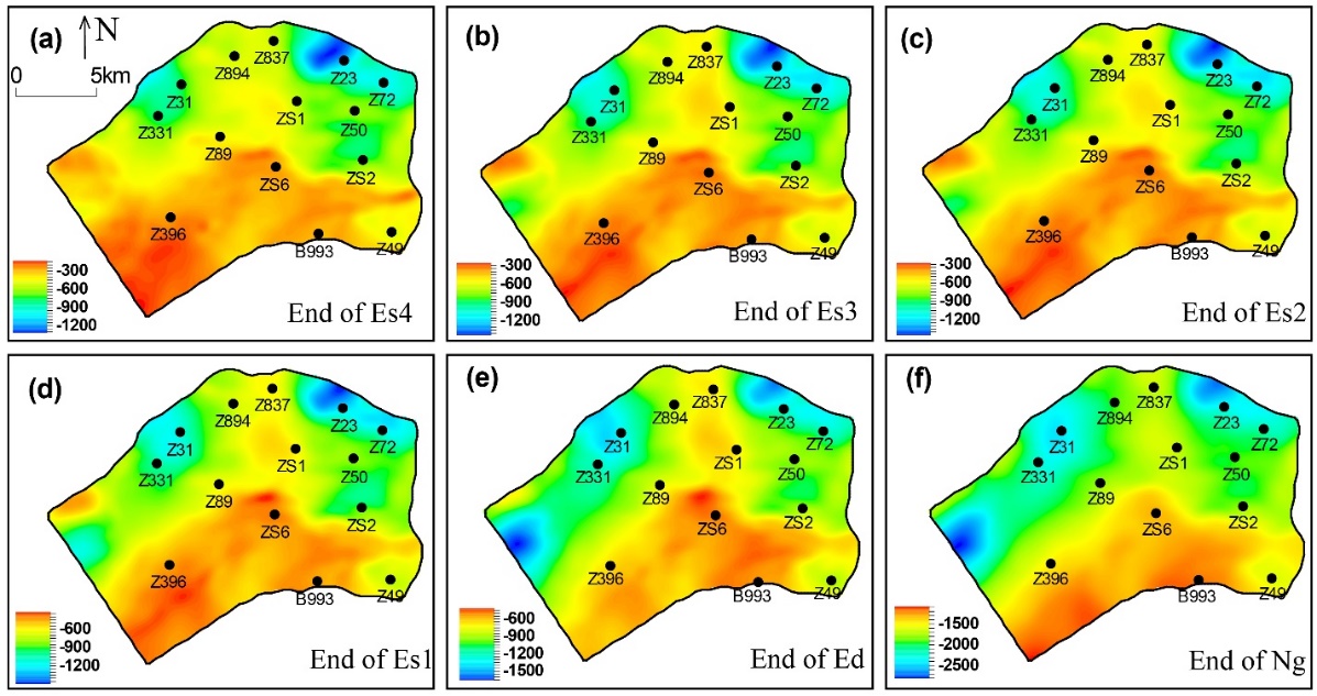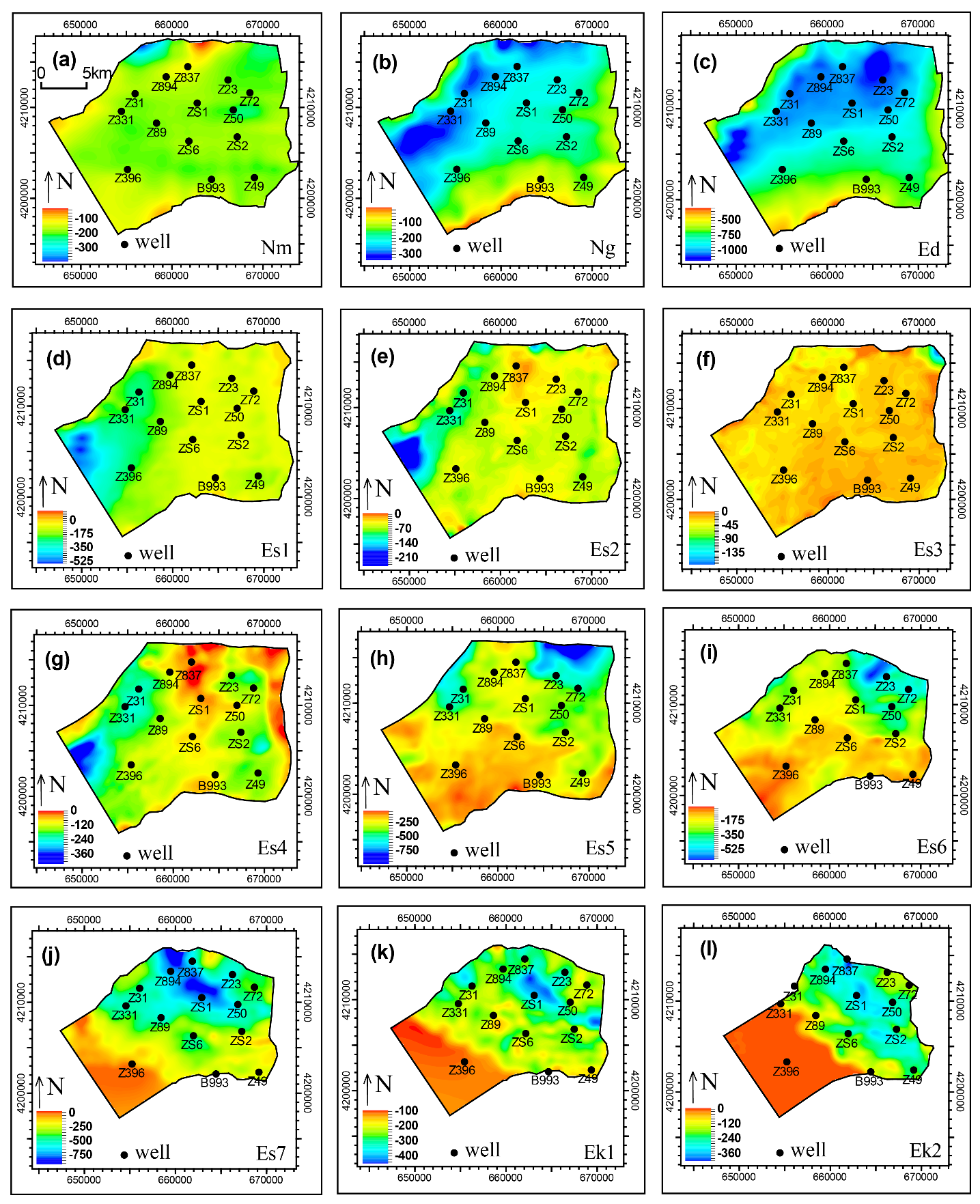 (a)明化镇组沉积期,(b) 馆陶组沉积期,(c)东营组沉积期,(d)沙一段沉积期(e)沙二段沉积期,(f)沙三上亚段沉积期,(g)沙三中亚段沉积期,(h)沙三下亚段沉积期,(i)沙四上亚段沉积期,(j)沙四下亚段沉积期,(k)孔一段沉积期 (l)孔二段沉积期。