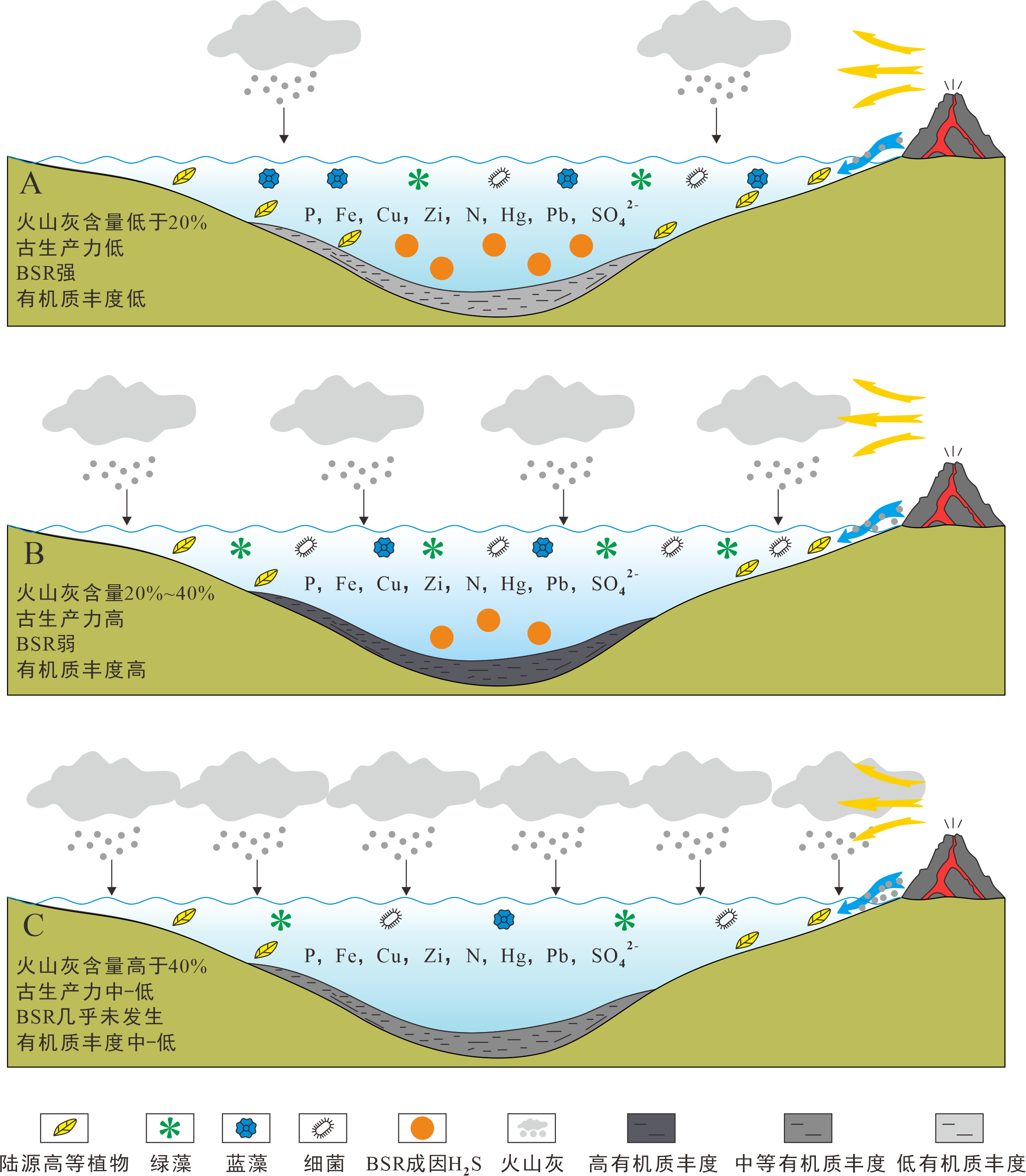 图1.吉木萨尔凹陷芦草沟组火山灰与有机质富集模式