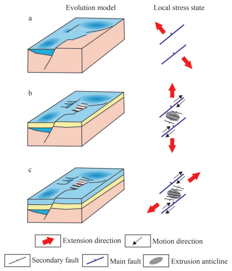 近年来,珠江口盆地油气勘探工作取得了一系列重要突破,其中位于文昌A凹陷的转换带内已发现超过2000万吨的油气量,是过去十年来珠江口盆地西部最大的油气发现。十大体育网站李伟副教授团队基于三维地震反射数据对文昌凹陷进行研究,并利用几口深井对数据进行校准处理,确定了文昌凹陷新生代层序中7个关键的地震反射界面,识别并描述出了文昌A凹陷转换带的几何形态,并利用断层活动速率参数确定了转换爱主次级断裂的演化规律,恢复了文昌凹陷新生代的构造演化史(图1),计算得出了不同地质时期不同方向的变形速率,并由此可确定出各地质时期的区域伸展方向和强度。研究结果表明文昌A凹陷南部发育大型合成超覆转换带,转换带南部断裂和6号断裂为其主要断裂,在转换带内及周围发育大量北西向次级断裂,与主断裂几乎垂直或成大角度相交,东向断裂和北西向断裂的共轭交汇区为油气运移和聚集提供了更多的机会。此外,转换带发育受先存断裂与区域应力转换的相互作用控制(图2),在古新世和始新世,主要断裂的不同活动导致了接力斜坡和超覆转换带的形成;进入渐新世至早中新世时期,北东向和北西向的断裂在斜向伸展作用下重新激活,而转换带内的断裂发育主要是通过先存北西向断裂的重新激活来实现的。从中新世中期开始,在北北东向的伸展作用下,北东走向的走滑断裂占主导地位,并建立了低幅度的断裂背斜,其构造演化过程不仅展示了转换带的动态演化史,而且对于理解油气在该区域的分布具有重要意义。