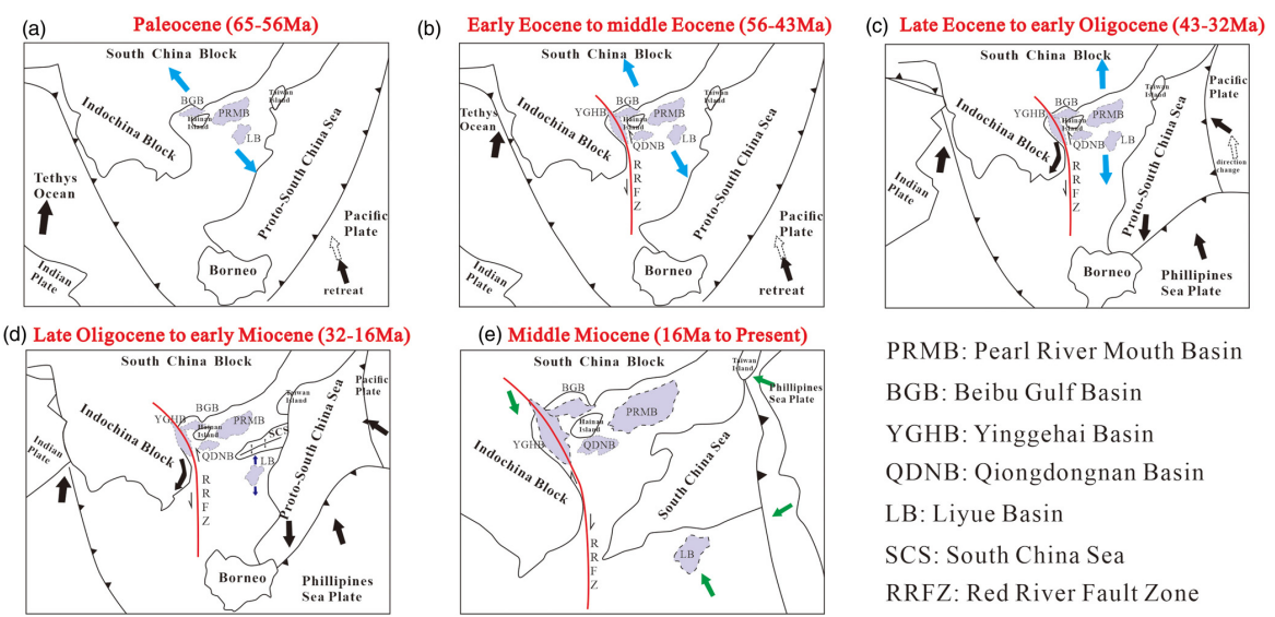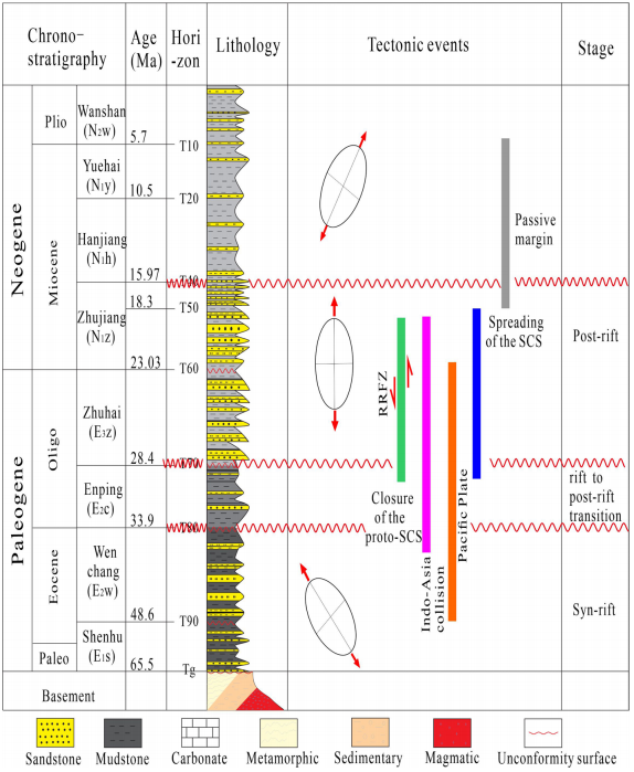 断陷盆地的构造演化的复杂性,通常受多种因素的影响。前人研究表明,多期非共线构造应力会导致复杂的盆地演化。先存断裂的不同活动模式也会对盆地断裂系统产生不同的影响,多期应力和先存断裂在盆地中形成了复杂的断裂网络,进一步影响了沉积物的分布和流体(例如石油、地下水或岩浆)的流动。位于南海北部的珠三坳陷是新生代期间形成的被动伸展边缘盆地,其构造演化与周围板块的运动密切相关,该盆地的演化以及内部断裂系统的时空分布反映了区域应力状态和先存断裂的特征。尽管前人研究证实了珠三坳陷形成了以北东向、北北东向、东西向和北北西向为主的断裂系统,但不同走向的断裂起源仍然存在疑问,且由于以往地震数据的品质制约了对这一区域的深入分析。