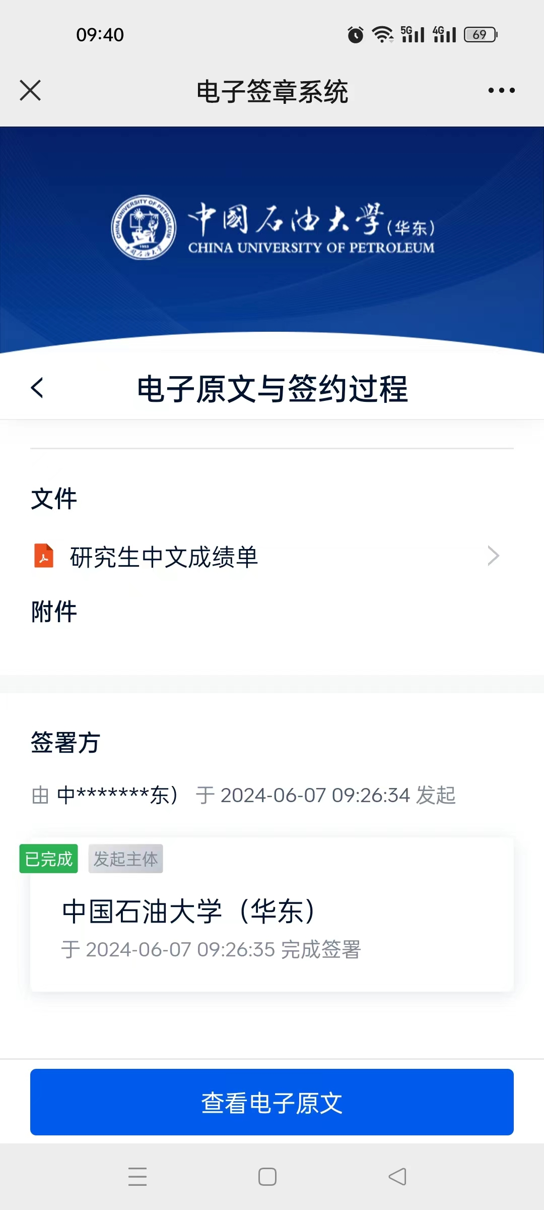 注意:同一种类型电子文档48小时内只可申请2次(第1次系统自动审核,第2次须管理端人工审核)。同时,只有电子文档申请审核通过后才能导出带有电子签章的成绩单。