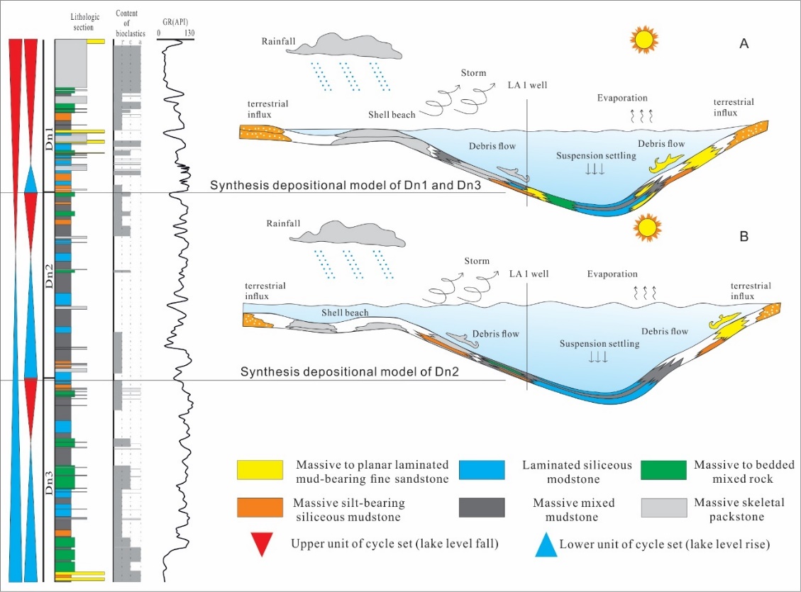 四川盆地为中国重要的含油气盆地,下侏罗统自流井组大安寨段是川中页岩油勘探的主要层位,前人研究成果表明,大安寨段沉积时期主要为滨浅湖、深湖-半深湖沉积环境,发育砂岩、泥岩、介壳灰岩等多种岩石类型,混合沉积较为发育,页岩、砂岩及混积岩共生特征。大安寨段从早到晚依次划分为大三亚段、大二亚段及大一亚段,其中,大一亚段和大三亚段以混合沉积、细粒沉积共同发育为特征,而大二亚段优势岩相为静水型细粒沉积,重力流型混合沉积发育较少。基于岩心观察、薄片鉴定、扫描电镜观察及全岩矿物含量分析,进行岩石类型的划分,在此基础上,进行岩相类型的划分,总结出六种岩相类型。根据不同岩相发育特征,分析其沉积动力和成因机制,结合沉积环境研究,探讨不同类型岩相发育的控制因素,最终建立大安寨段综合沉积模式。