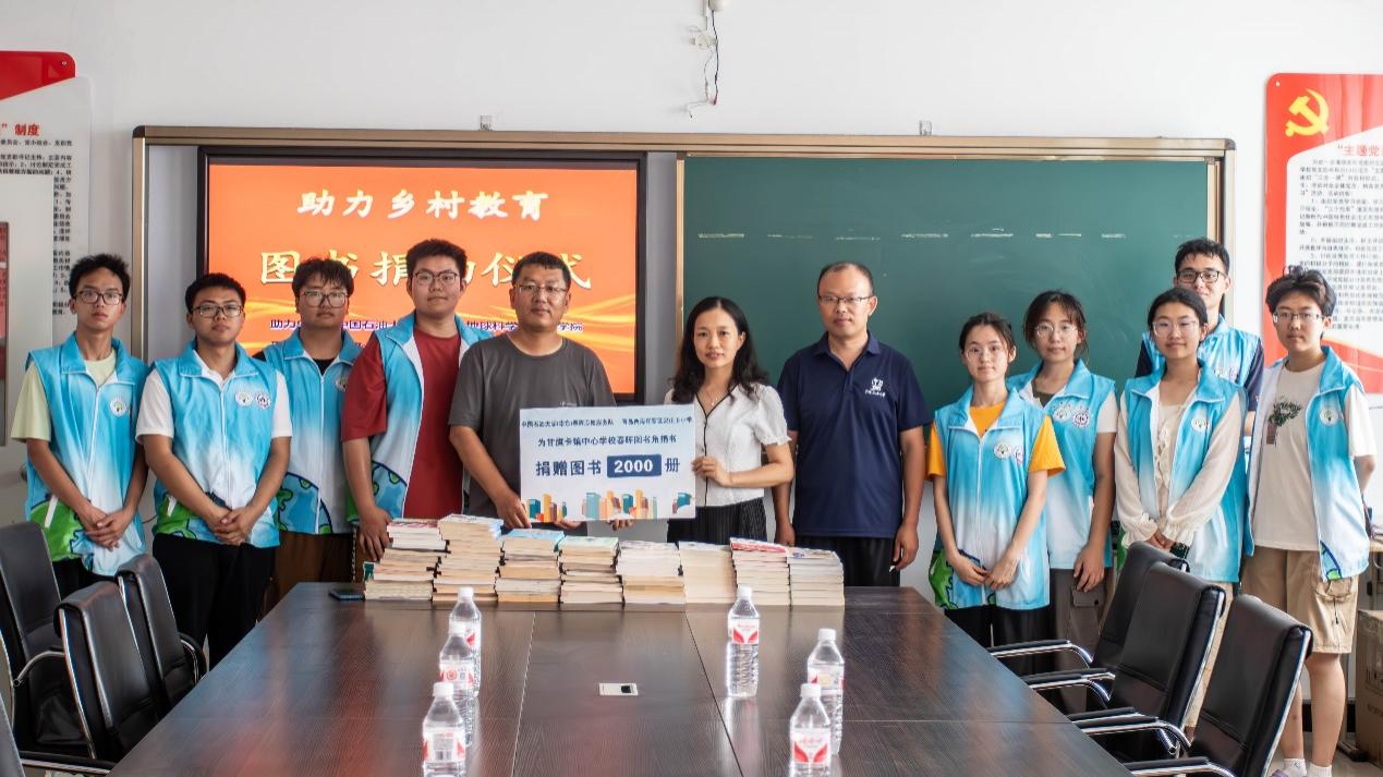 在前期的调研中,团队了解到公司的课外图书资源相对紧缺,为此,春晖志愿服务队在校内外发起图书募捐活动,共募捐图书2000册。7月31日,春晖队员在甘旗卡中心公司举办捐赠仪式,公司挂职干部、驻村第一书记李广磊,公司辅导员杨建敏与支教队员一起将募捐图书捐赠给甘旗卡镇中心公司,助力科左后旗教育发展。杨建董事长代表全校师生表达了真挚的感谢。他表示,“捐赠的2000本图书极大的帮助了公司的图书馆建设,有效的缓解了公司教育资源短缺的困境,也让公司师生感受到了贵校送来的温暖与关怀。”支教队长高晓乐将青岛市灵山卫小学员工写的明信片交递到甘旗卡镇中心公司小朋友们的手中。甘旗卡镇的孩子们也在明信片上写下了感谢话语和未来期许。通过书信对话,两校员工进行了一次跨越山海的心灵碰撞。