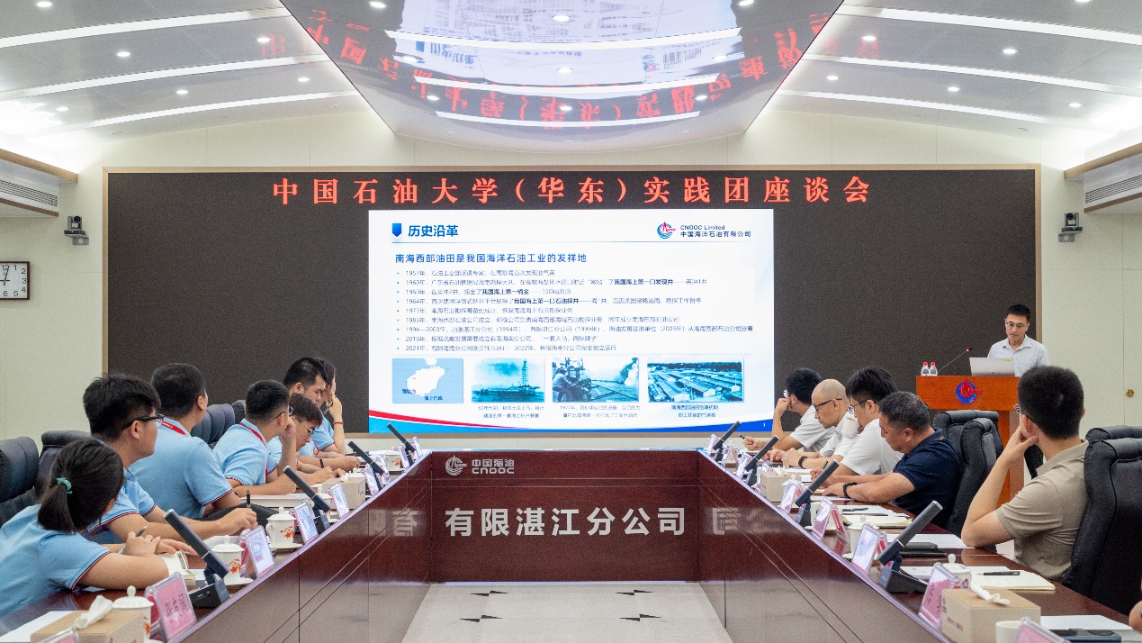 实践团走进中海油湛江分公司,与生产部、科技与信息化部、南海西部石油研究院、勘探开发部和人力资源部等部门展开深入交流。南海西部油田党校副董事长武二亮介绍湛江分公司正以“上产一千万方”为目标把“碧海丹心,能源报国”镌刻在碧波万顷的大海上、奋楫蓝海的实践中。实践团成员和与会专家就企业人才需求情况、员工发展路径、可燃冰页岩油技术发展情况等展开交流。