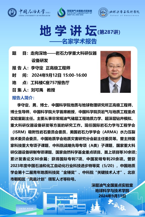 【地学讲坛第287讲】关于李守定 正高级工程师《走向深地——岩石力学重大科研仪器设备研发》学术报告的通知