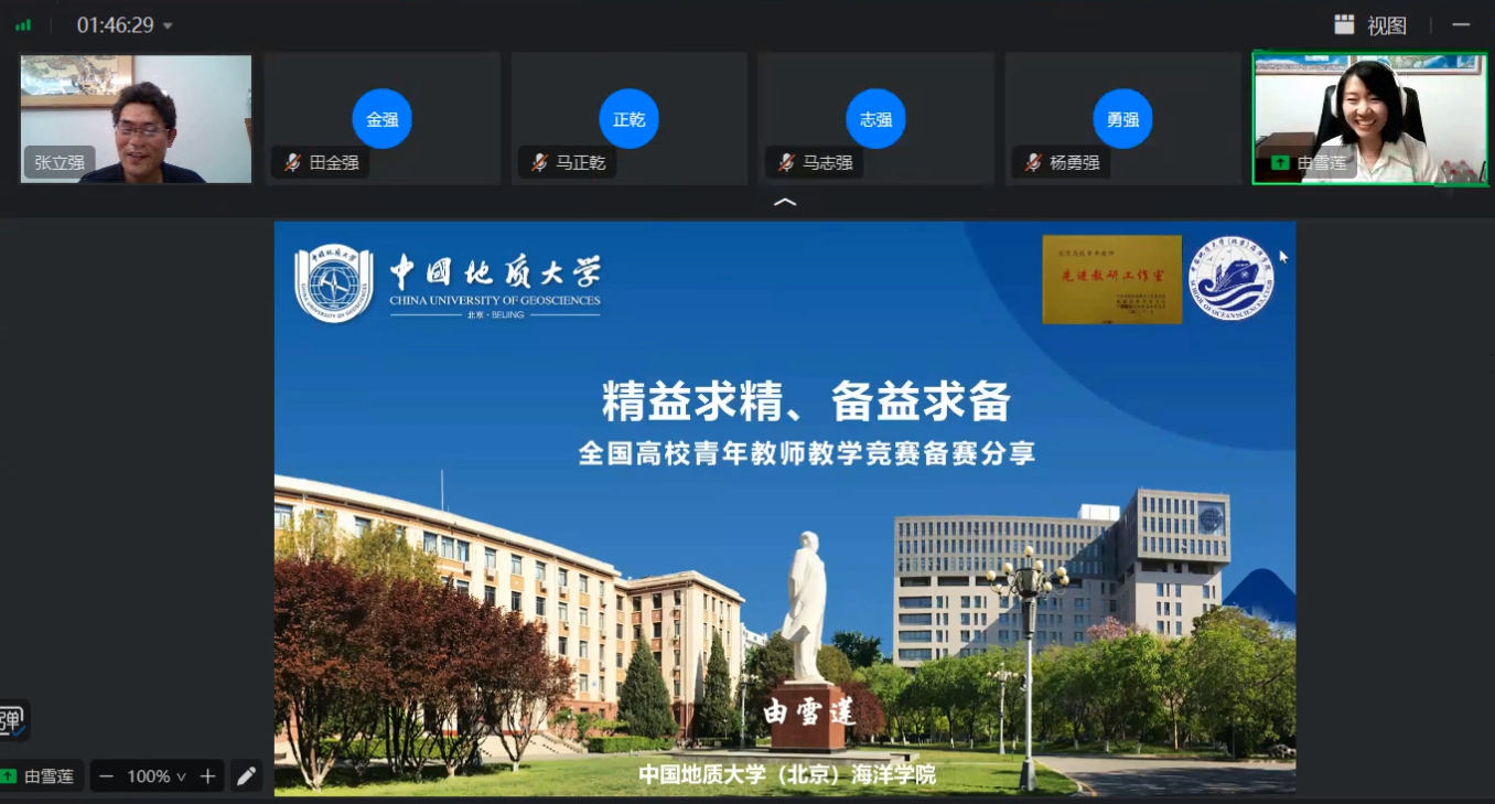 由雪莲副教授从自己参加全国青年教师讲课比赛的亲身经历入手,从全国高校青年教师教学竞赛介绍、参赛案例、解构参赛教学材料设计和参赛课堂展示节段设计原则及方法等几个方面深入细致地向参会教师分享了赛前备课和讲课的细节与经验。她讲述了历届讲课比赛对课程思政的系统要求,结合她的参赛案例展示了课程思政融入、联系学科前沿、动画展示等细节。针对全国青教赛教学材料的设计,由雪莲介绍了封面设计、课程名称、学情分析、教学目标、教学思想、课程资源、教学内容、教学重点与难点、教学方法与工具、教学安排、教学评价、预习任务与课后作业等内容,其中,教学目标包括:知识目标、能力目标和情感价值,向员工传达地质精神和家国情怀。