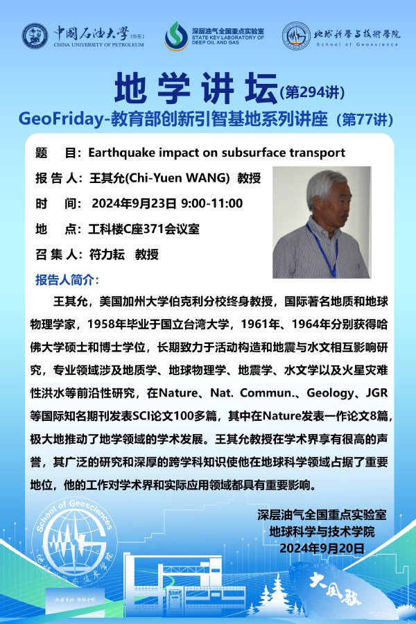 【地学讲坛第294讲】关于王其允(Chi-Yuen WANG) 教授《Earthquake impact on subsurface transport》学术报告的通知
