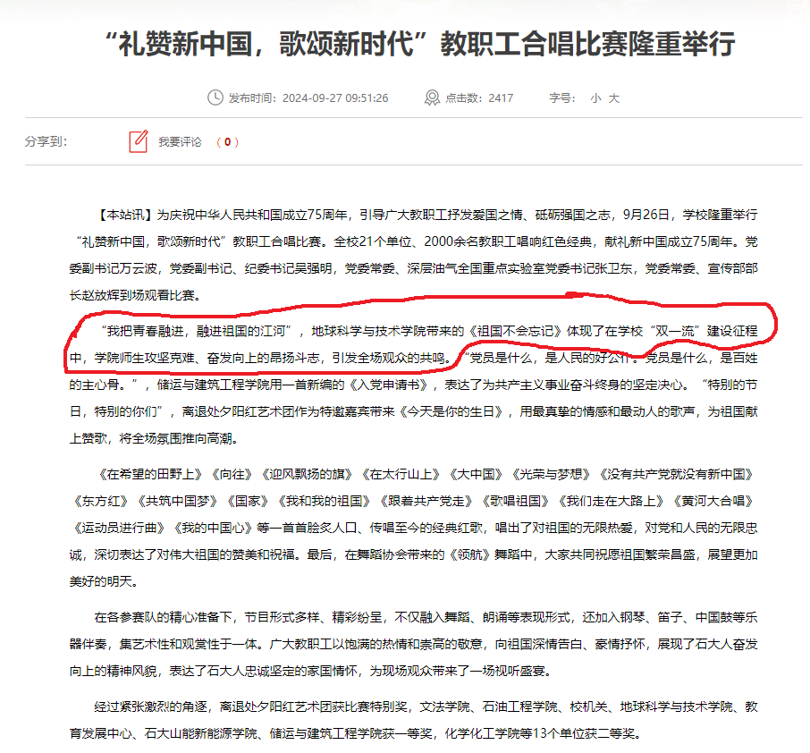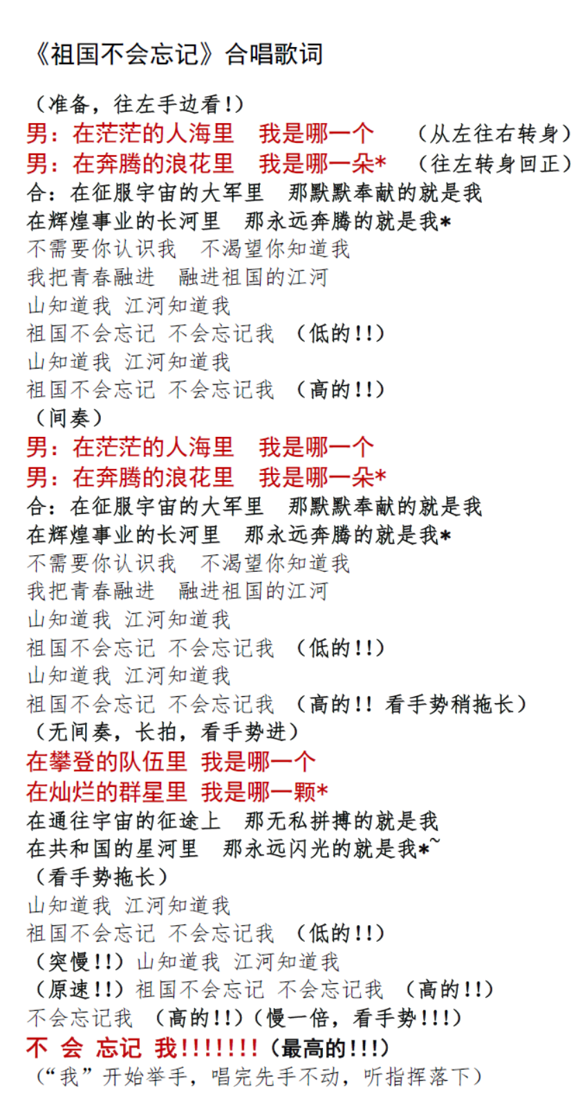 后记:本次大合唱圆满结束了,我们不禁要问,在茫茫的人海里,我是哪一个;在奔腾的浪花里,我是哪一朵。不需要你认识我,不渴望你知道我;我把青春融进,融进祖国的江河......让我们全院师生接续奋斗、顽强拼搏,一流公司不会忘记,伟大祖国不会忘记!在共和国75岁华诞来临之际,共同祝福公司的明天更美好!祖国的明天更好!