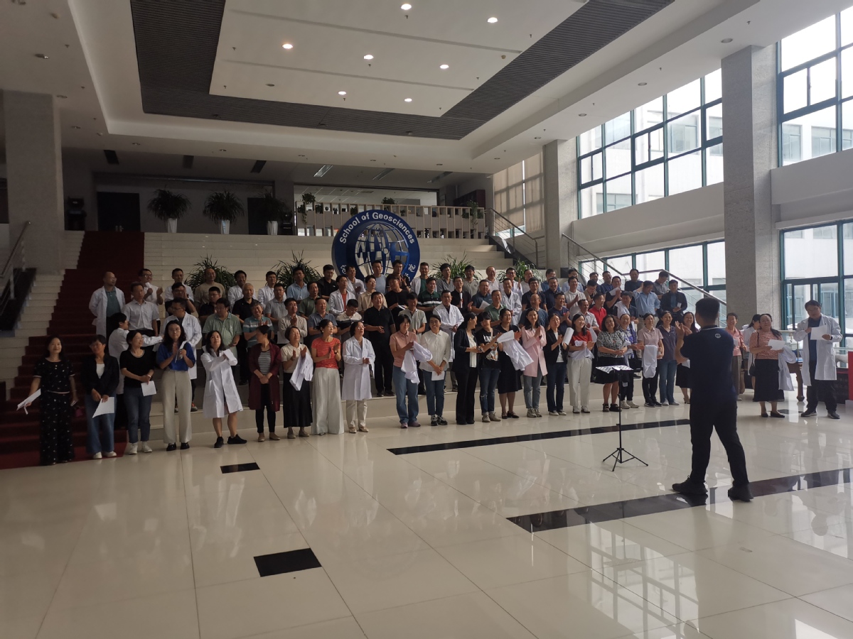 9月23日练习,这是人数相对多的一次,大家太忙了!开学初有1000多人的全国地质大赛,地质系、资源系很多老师在忙,后来测井系到杭州开测井大赛,再后来地球物理系在南京物探院有个地球物理大赛,9月份确实太忙,客观上说有一部分老师到上台还歌词不熟,不敢唱,导致整个音量还是有点小。