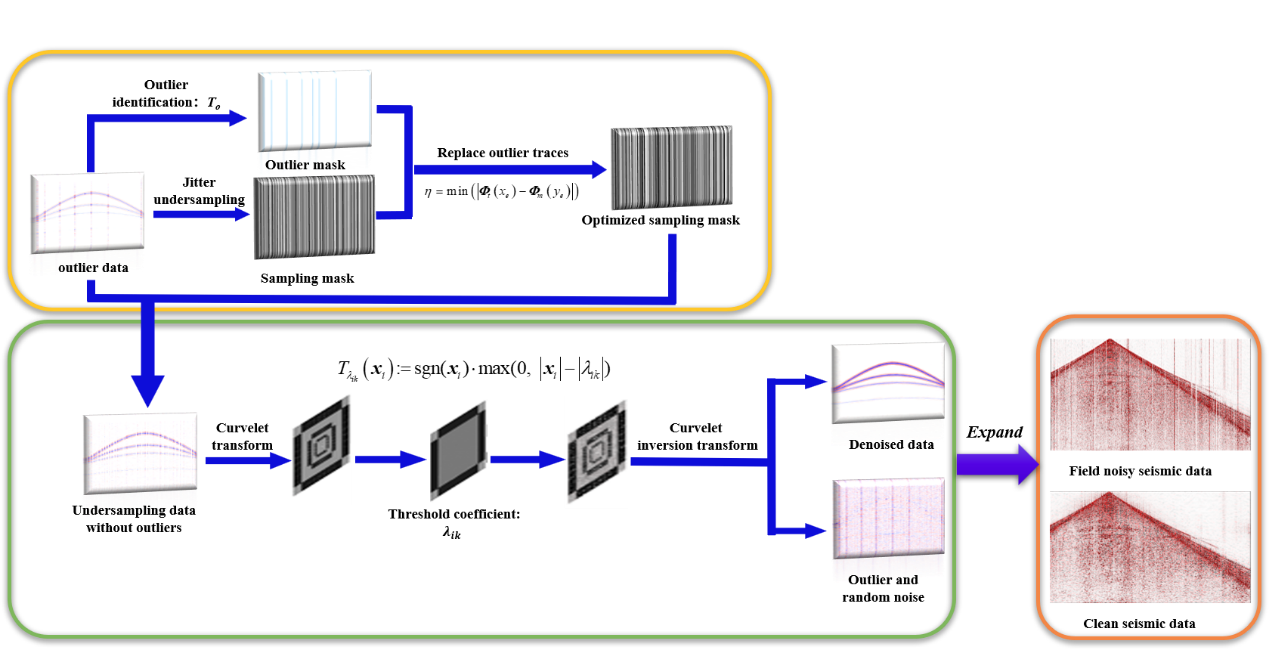 异常值噪声通常是指在幅度上与有效信号显著不同的一个或一组波形。在地震数据处理中,离群点的出现会导致数据的总体统计误差很大,且地震数据不同于图像,常规反演去噪方法无法对存在异常值噪声的数据进行有效压制。为了解决这一问题,十大体育网站杨继东教授团队系统开展了一种基于统计学优化的离群噪声压制方法,并将其结合到压缩感知(CS)框架中。首先利用地震数据振幅标准差的均质性统计,来分析识别离群噪声道的位置。将异常道位置与jittered采样生成的掩模矩阵进行对比,并将具有异常噪声的抖动掩模的采样道替换为它们附近的未采样道(图1)。优化的采样矩阵使我们能够在不破坏稀疏采样率的同时,有效地识别和剔除离群信号。这种优化的掩模策略将离群去噪问题转化为数据重构问题。利用软阈值迭代求解算法求解稀疏约束反问题,恢复零值位置处的信号(图2)。该研究所提方法的去噪效果整体上优于传统的f-x反褶积和中值滤波方法,能够准确地压制野值噪声,恢复丢失的期望信号。