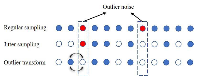 图1.异常值掩码替换策略。红点表示异常值道位置,蓝点表示正常采样道,空心点表示未采样位置。