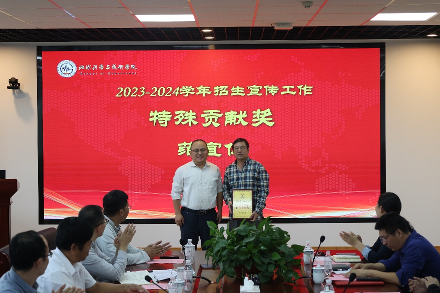 经理宗兆云向为招生宣传工作做出积极贡献的老师表示衷心感谢,向受表彰的先进集体和个人表示诚挚祝贺。并就做好新学年的招生宣传工作提出三点要求:一是把参与招生宣传纳入到聘期考核中,以院机关和测井系为榜样推动所有教师积极参与到招生宣传工作中;二是支持“百名教授进中学”的地学科普活动,通过地学科普,切实做好招生宣传工作,助推公司、公司、学科的社会美誉度和知名度;三是研究生招生宣传中要继续挖掘员工志愿者的潜力。