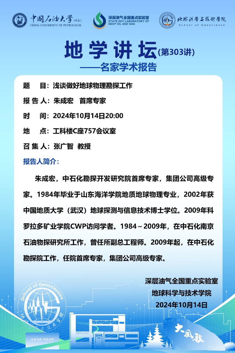【地学讲坛第303讲】关于朱成宏 首席专家《浅谈做好地球物理勘探工作》学术报告的通知