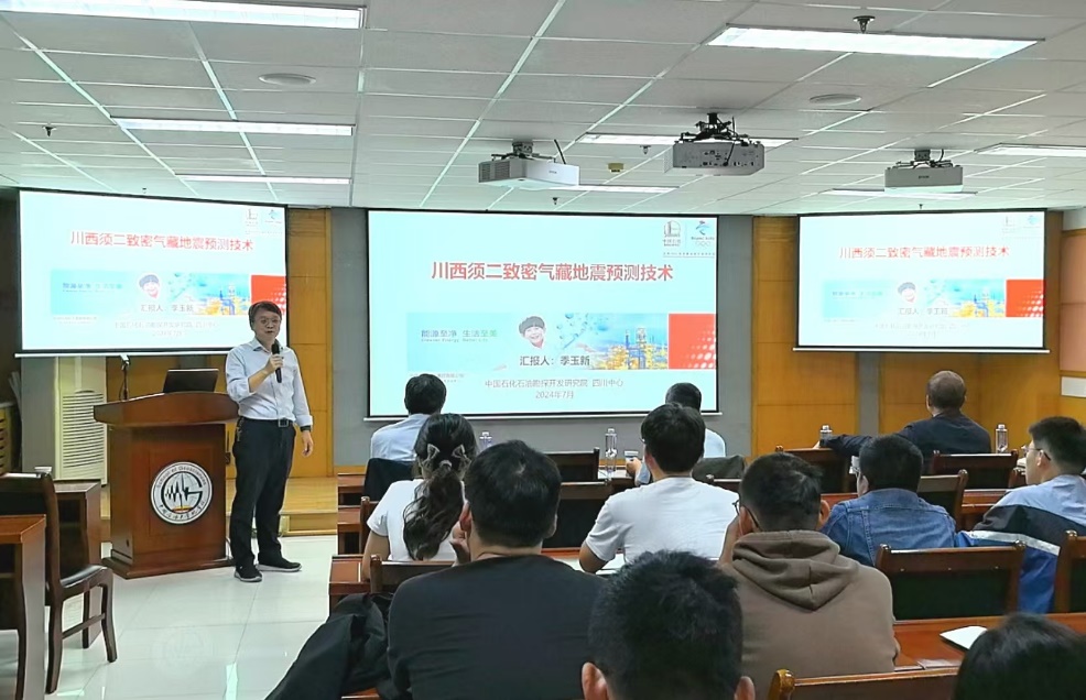 季玉新首席首先作题为“川西须二致密气藏地震预测技术”的学术报告。他以一幅“须二段气藏甜点模式图”出发,针对须二段致密气藏甜点类型开展的地震预测技术攻关等相关工作展开介绍,其中详细介绍了断褶裂缝体刻画、分频重构高分辨率反演以及提高储层参数反演精度方法等。随后他提出一系列在实际生产工作中仍亟待解决的相关问题,并表示地球物理勘探还有很长的路要走,鼓励同学们致力于科研,推动国家能源事业前进。