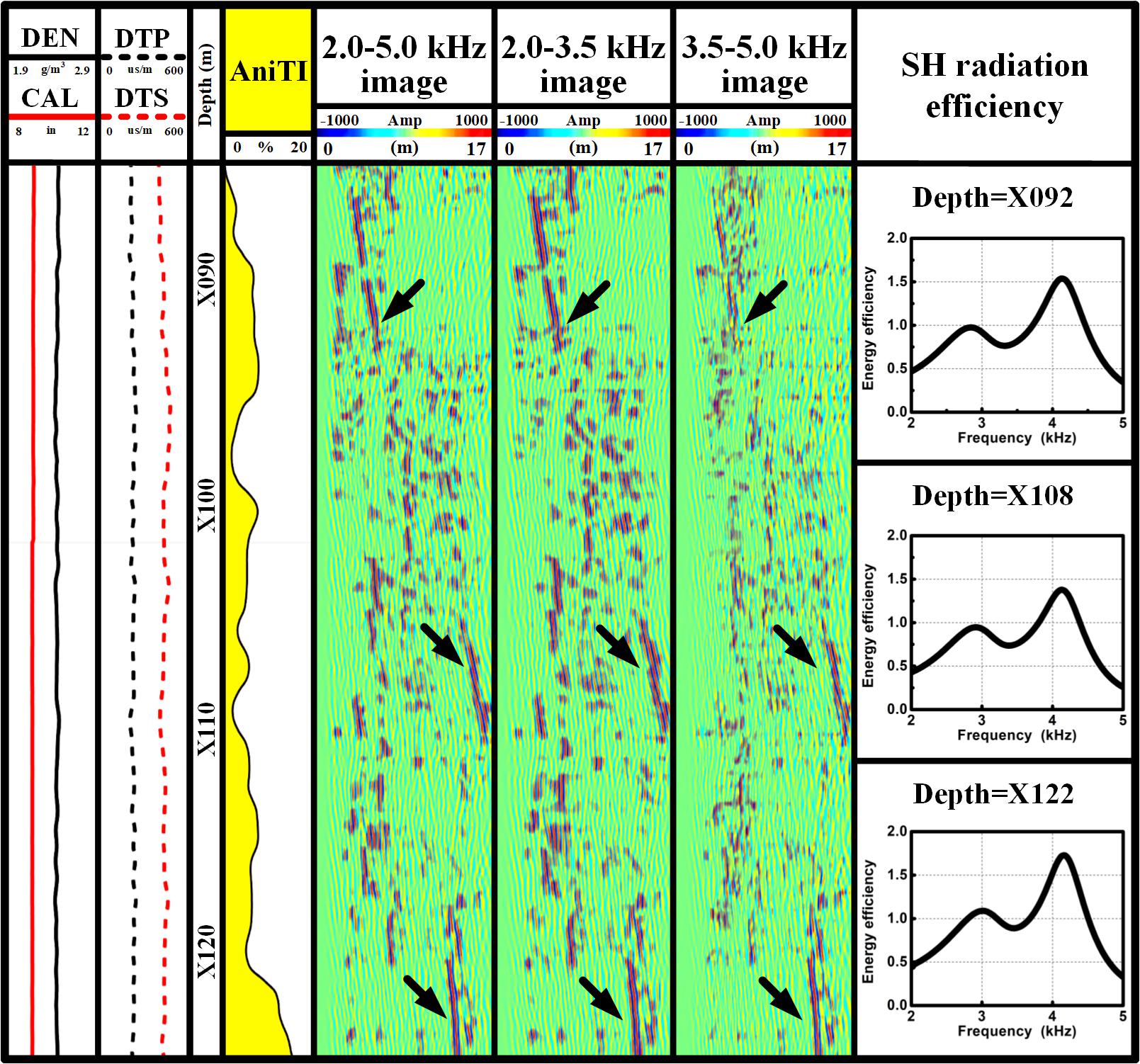 图2.使用辐射效率(第7道)解释各向异性地层中2.0-5.0 kHz(第4道)、2.0-3.5 kHz(第5道)和3.5-5.0 kHz(第6道)不同频段成像的现场实例(第3道显示该井段的横波各向异性较高)。第1道给出CAL和DEN曲线。